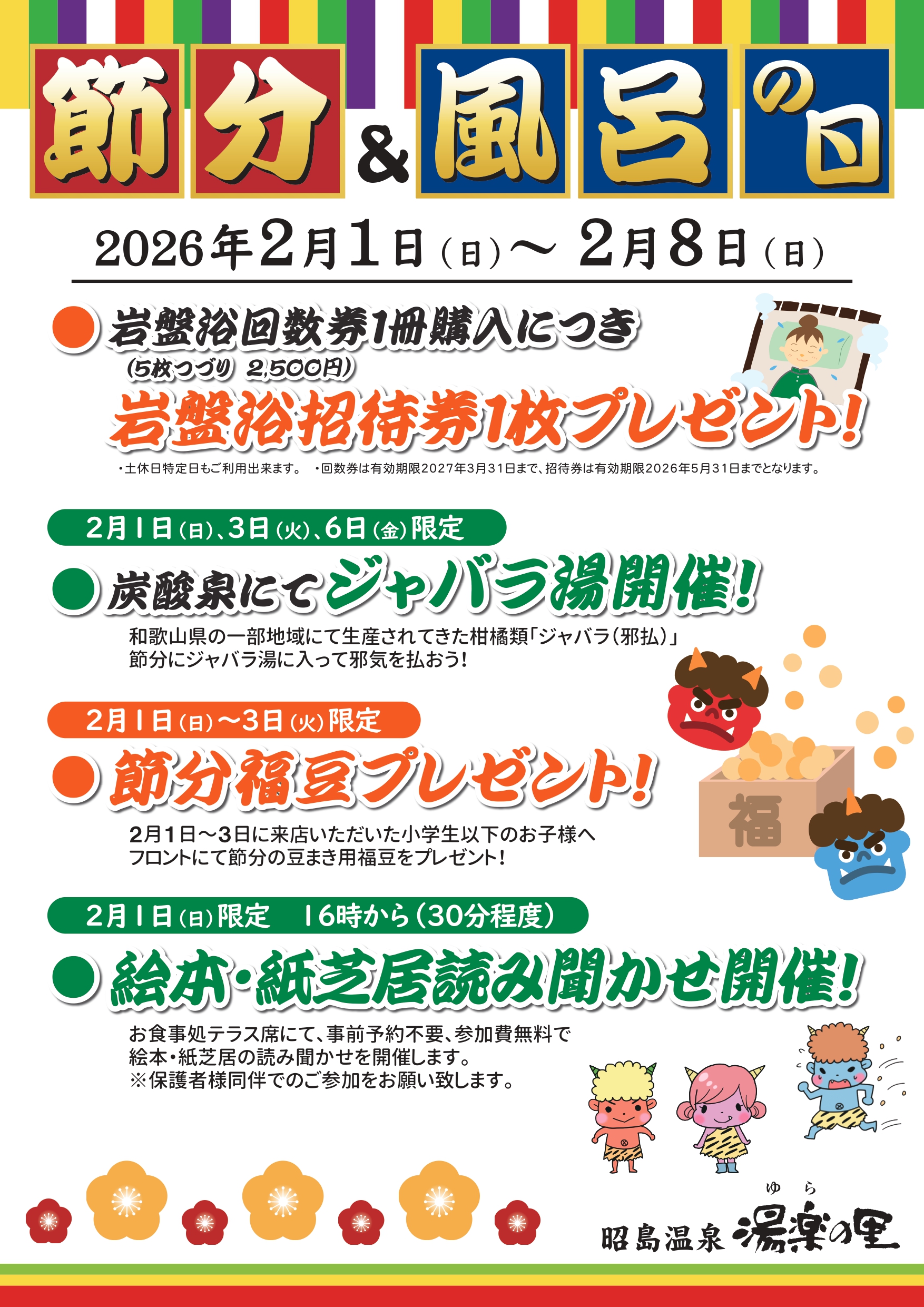 HOME 新着情報 節分&風呂の日イベント開催のお知らせ 2/1(日)~2/8(日) Newsお知らせ 2026年01月16日キャンペーン・イベント 節分&風呂の日イベント開催のお知らせ 2/1(日)~2/8(日) 一覧に戻る