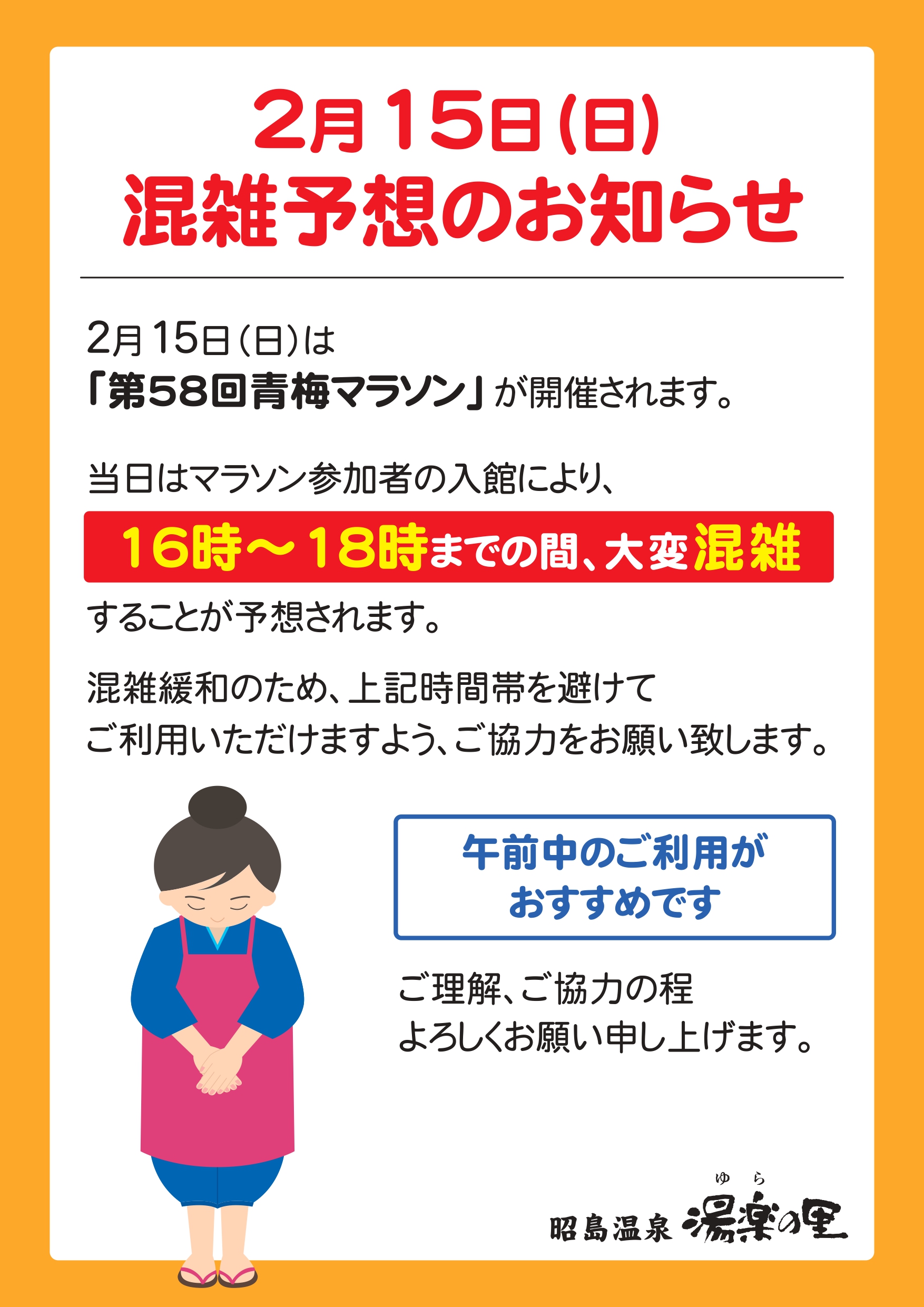 2月15日(日)マラソン大会による混雑予想のお知らせ