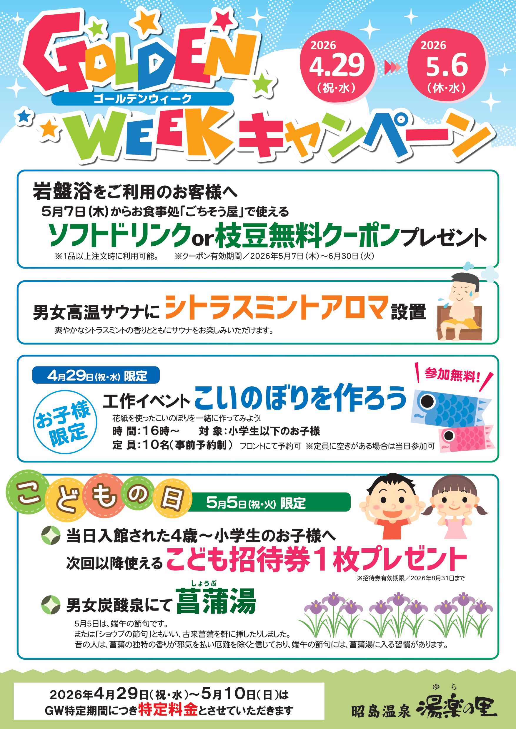 HOME 新着情報 GWキャンペーン開催のお知らせ 4/29(水)~5/6(水) Newsお知らせ 2026年04月13日キャンペーン・イベント GWキャンペーン開催のお知らせ 4/29(水)~5/6(水) 一覧に戻る