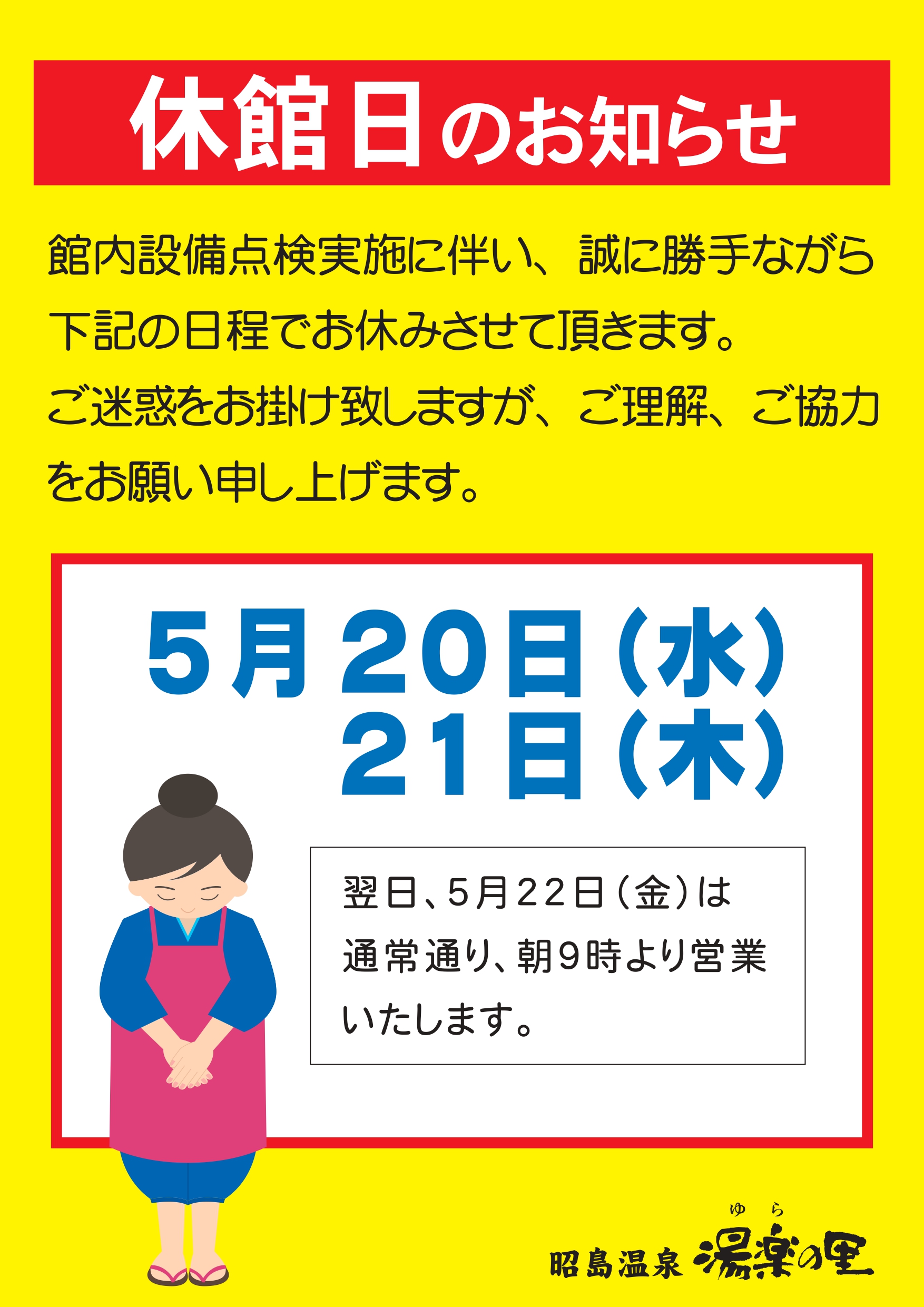 休館日のお知らせ 5月20日(水) ~5月21日(木)