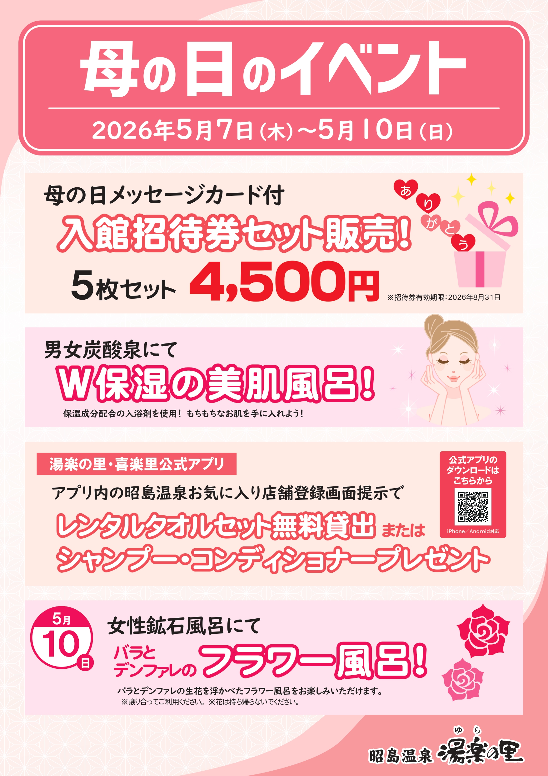 HOME 新着情報 母の日イベント開催のお知らせ 5/7(木)~5/10(日) Newsお知らせ 2026年04月21日キャンペーン・イベント 母の日イベント開催のお知らせ 5/7(木)~5/10(日) 一覧に戻る