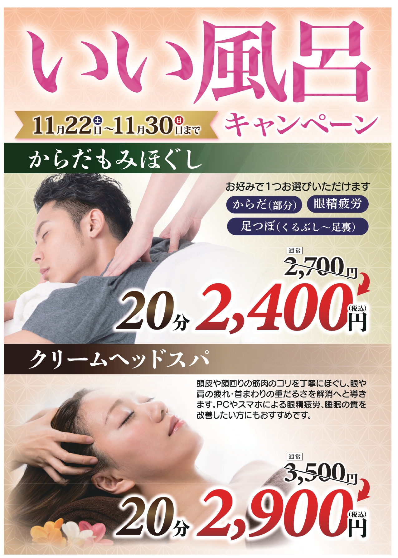 新着情報 News HOME 新着情報 ボディケア・あかすり期間限定メニューのお知らせ【11月22日(土)~11月30日(日)】 2025-11-08お知らせ ボディケア・あかすり期間限定メニューのお知らせ【11月22日(土)~11月30日(日)】 一覧に戻る