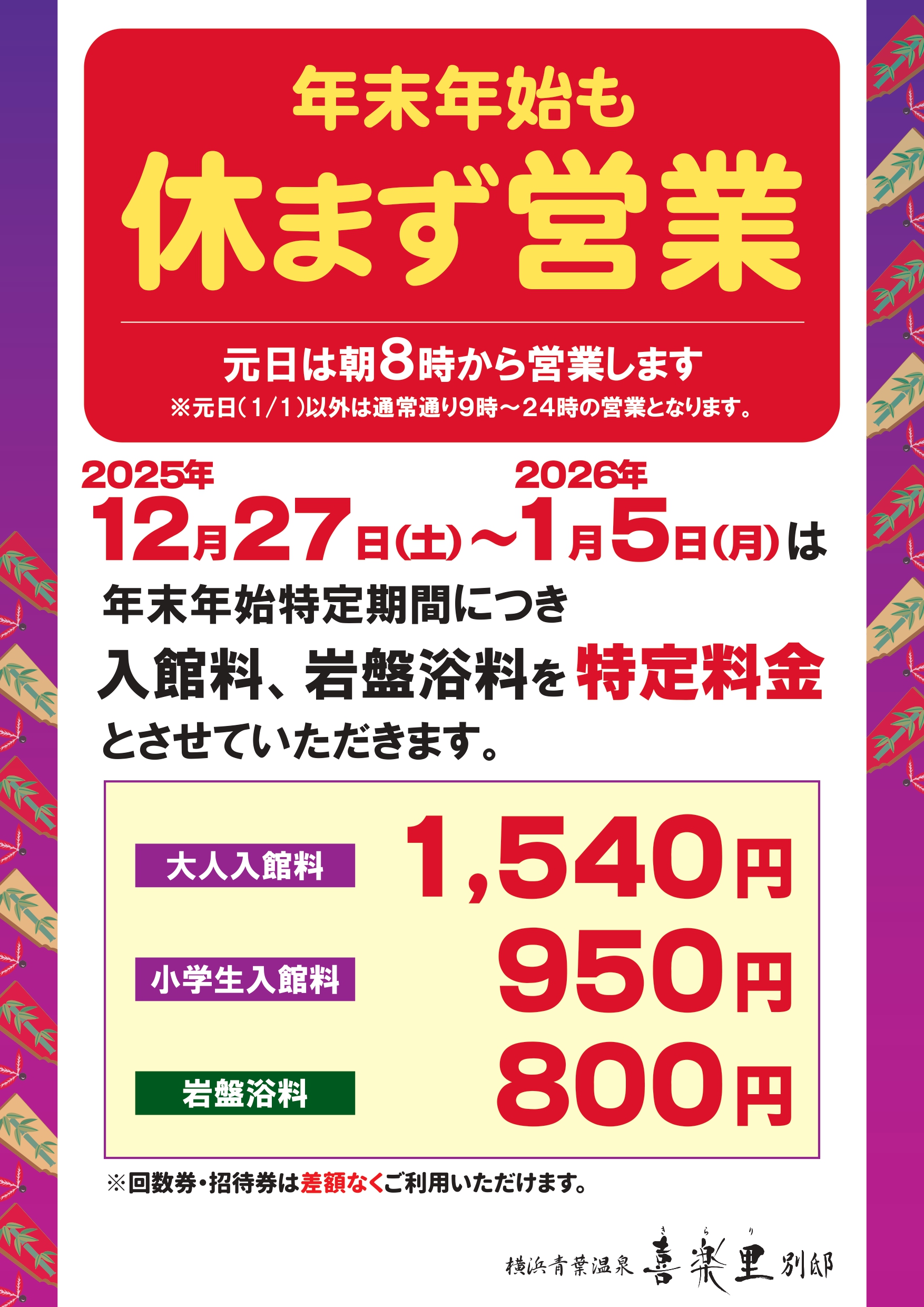 年末年始特定期間につき入館料と岩盤浴料金を特定料金とさせていただきます。