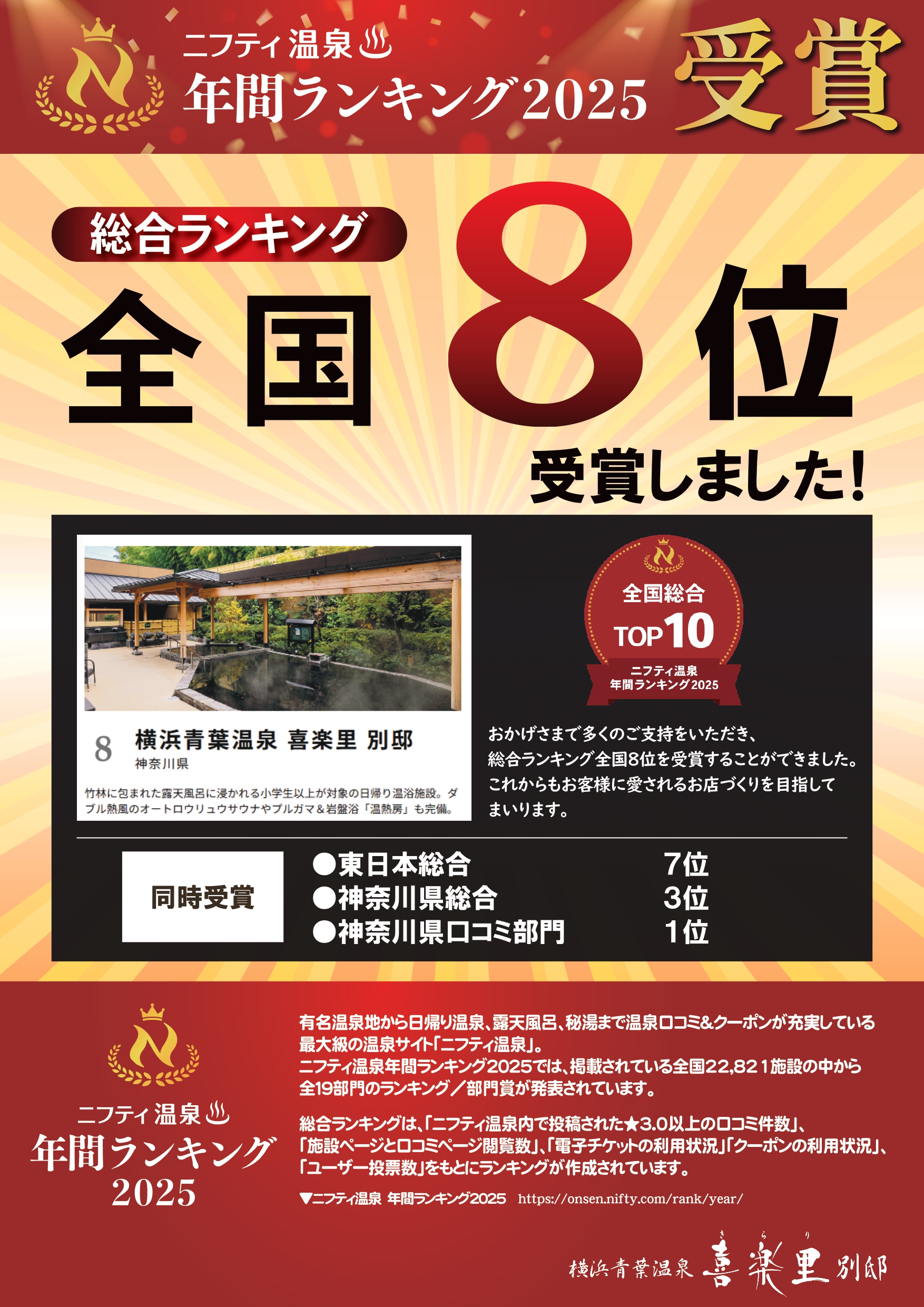 皆さまのご支持のおかげで、 ニフティ年間ランキング2025の『総合ランキング 全国8位』を受賞することができました!