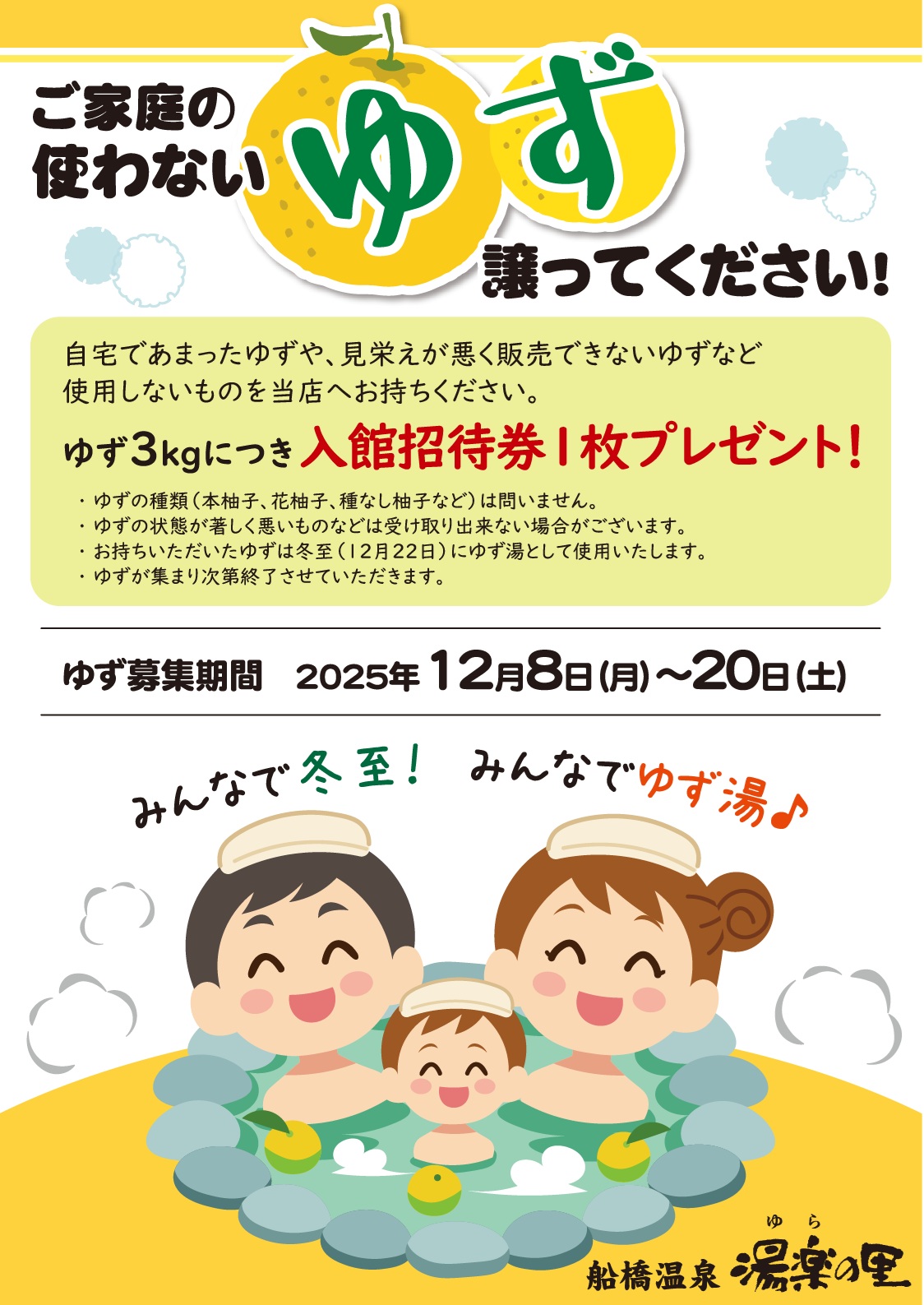 新着情報 HOME 新着情報 ゆず譲ってください!【ゆず募集期間12月8日(月)~12月20日(土)】 2025年12月08日お知らせ ゆず譲ってください!【ゆず募集期間12月8日(月)~12月20日(土)】 一覧に戻る