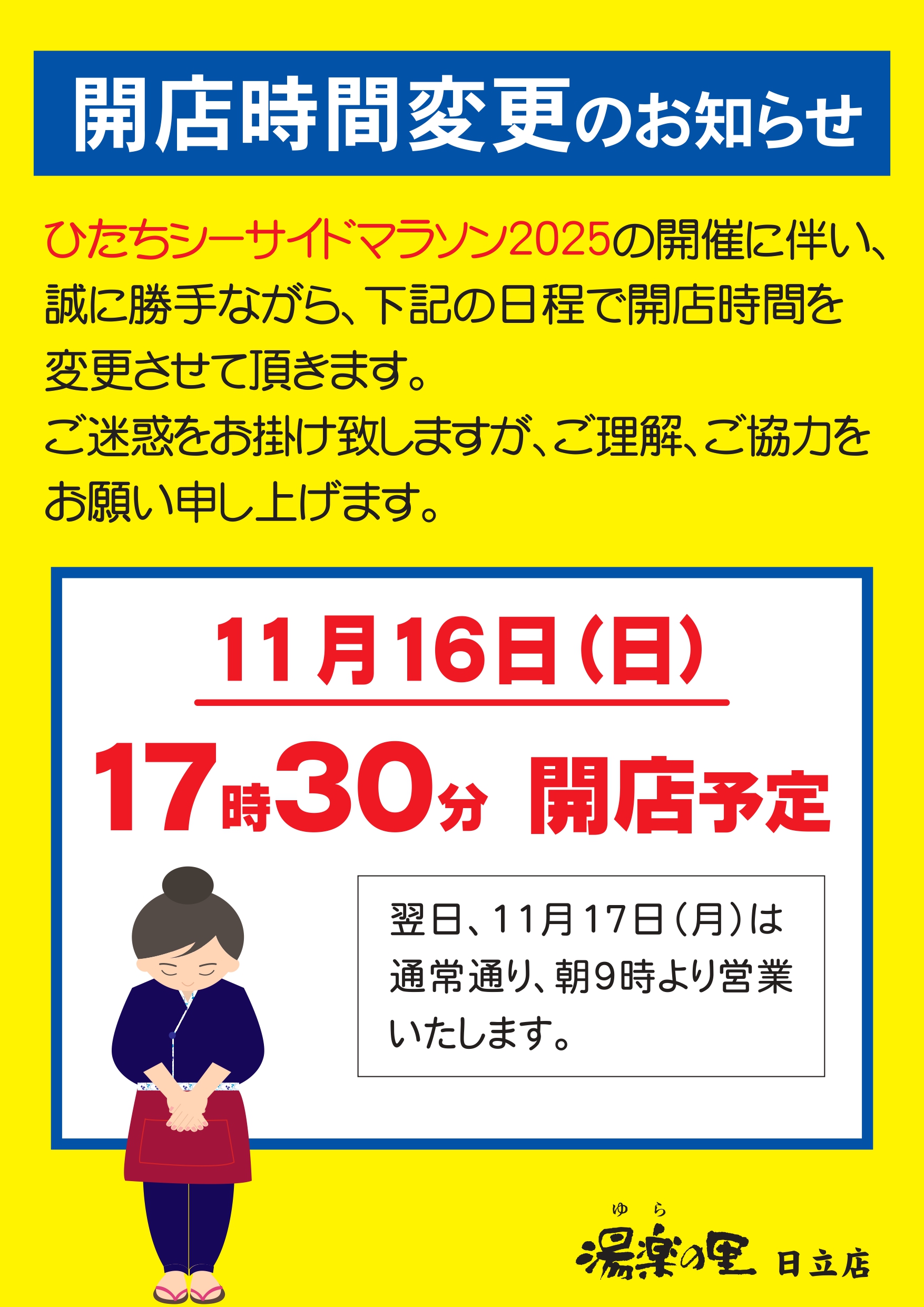 2025/11/16(日) 営業時間変更のお知らせ