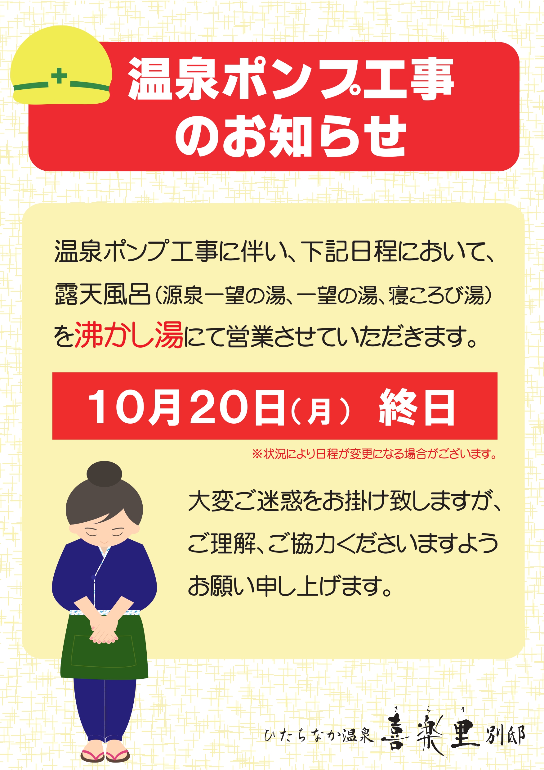「温泉ポンプ工事」および「露天沸かし湯営業」のお知らせ 10月20日(月)