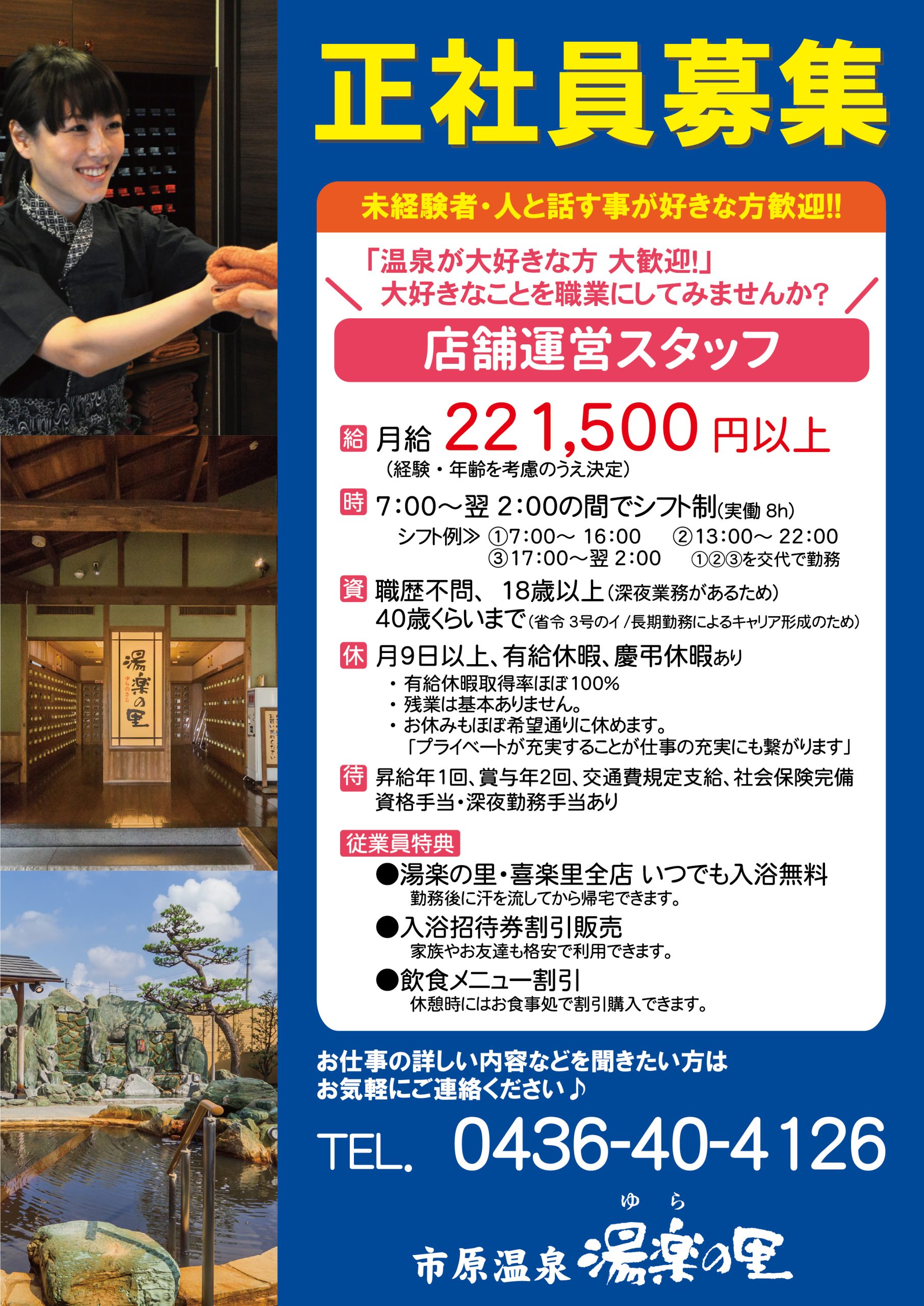 下記は「市原温泉 湯楽の里」の募集内容となっておりますが、店舗により勤務時間は異なります。