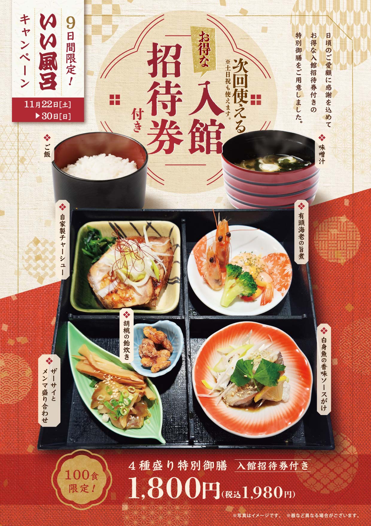 お食事処【咲楽(さくら)】より (11/22~30 限定100食)次回使える入館招待券付き特別御膳