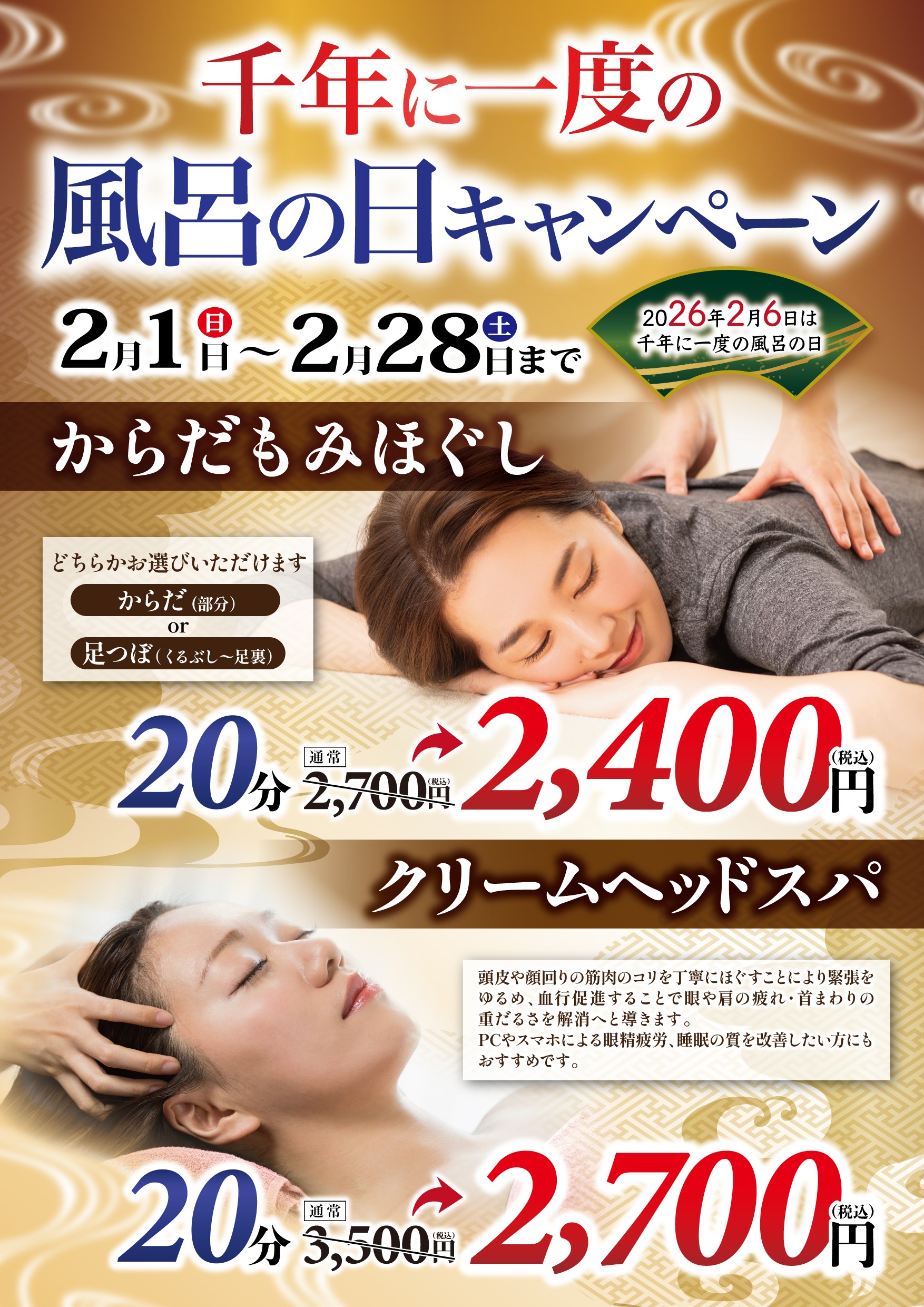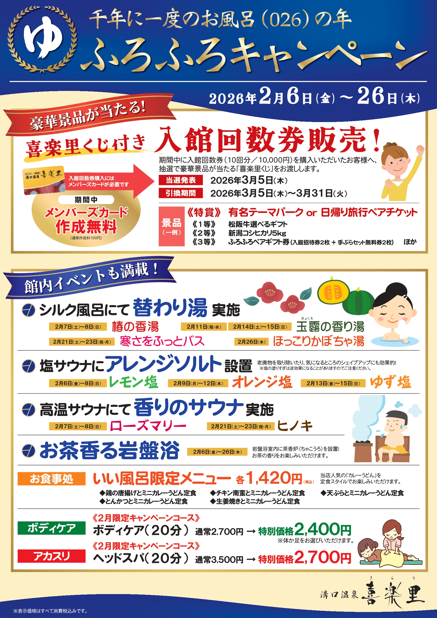 2026年は千年に一度のお風呂の年!ふろふろキャンペーン開催いたします。 期間:2026年2月6日(金)~2月26日(木)までの21日間 豪華景品の当たる喜楽里クジ付き回数券販売を始め、イベント内容盛沢山♪