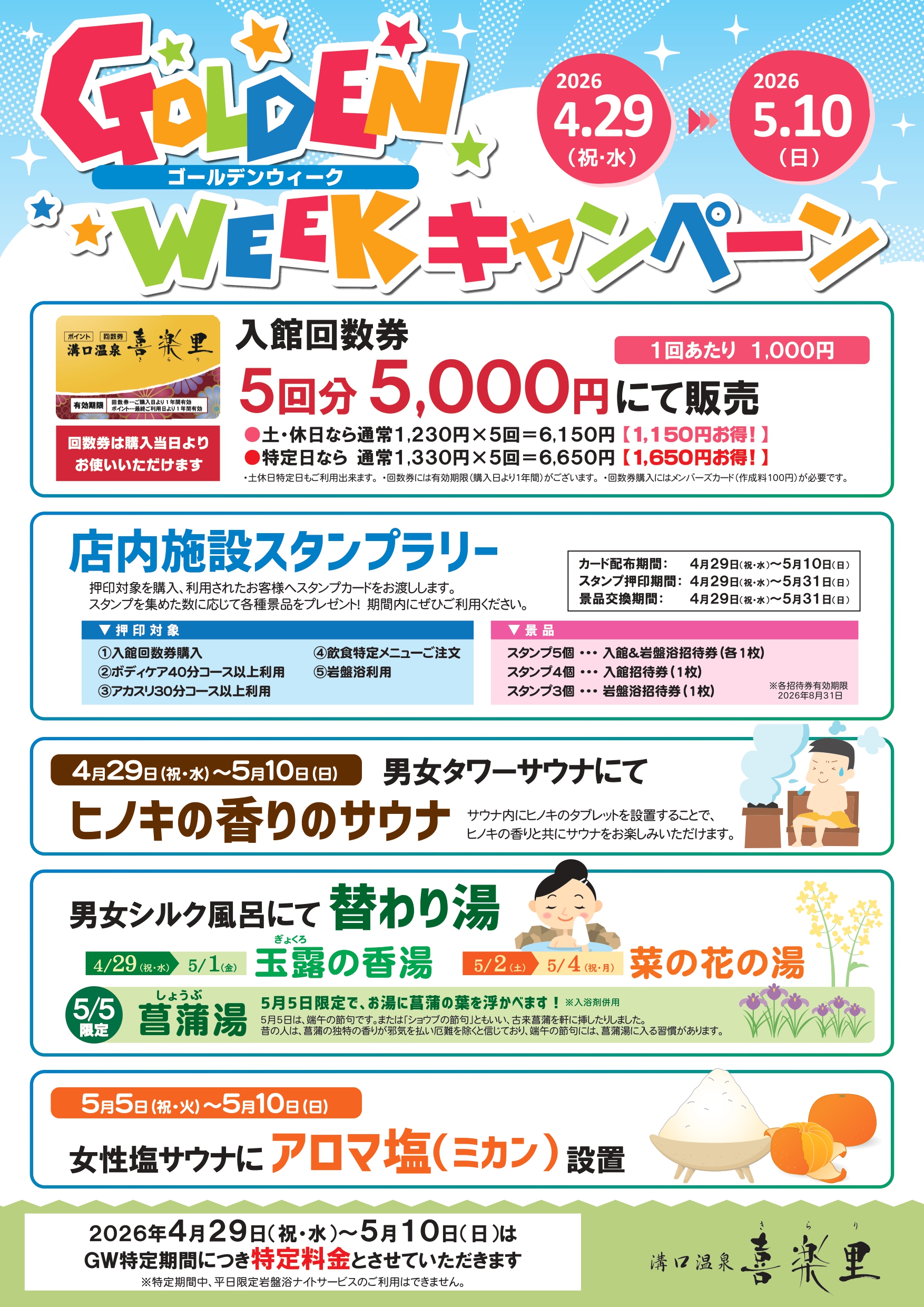 4月29日(祝・水)~5月10日(日)までの期間開催いたします。 ★入館回数券5回分5,000円にて販売 土日祝特定日も差額なくご利用いただけますので、期間中は回数券がお得です! ★店内施設スタンプラリー! スタンプを集めた数に応じて各種景品をプレゼント!期間内に是非ご利用くださいませ。 ≪GWキャンペーン詳細はこちらをご覧ください。≫