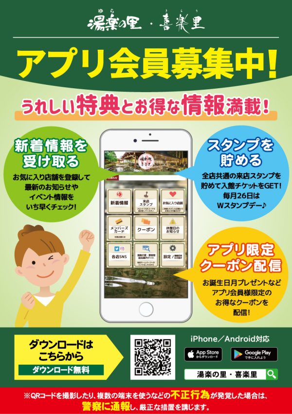 お得な情報2025.04.01湯楽の里・喜楽里 公式アプリ会員募集中!