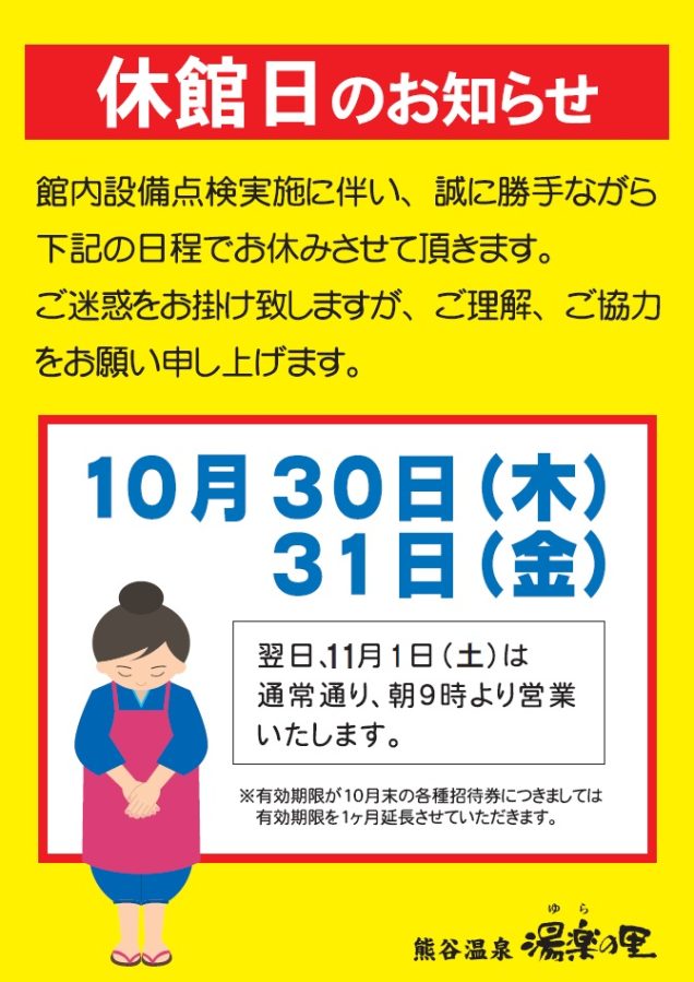 休館日のお知らせ 10月30日(木)~10月31日(金)