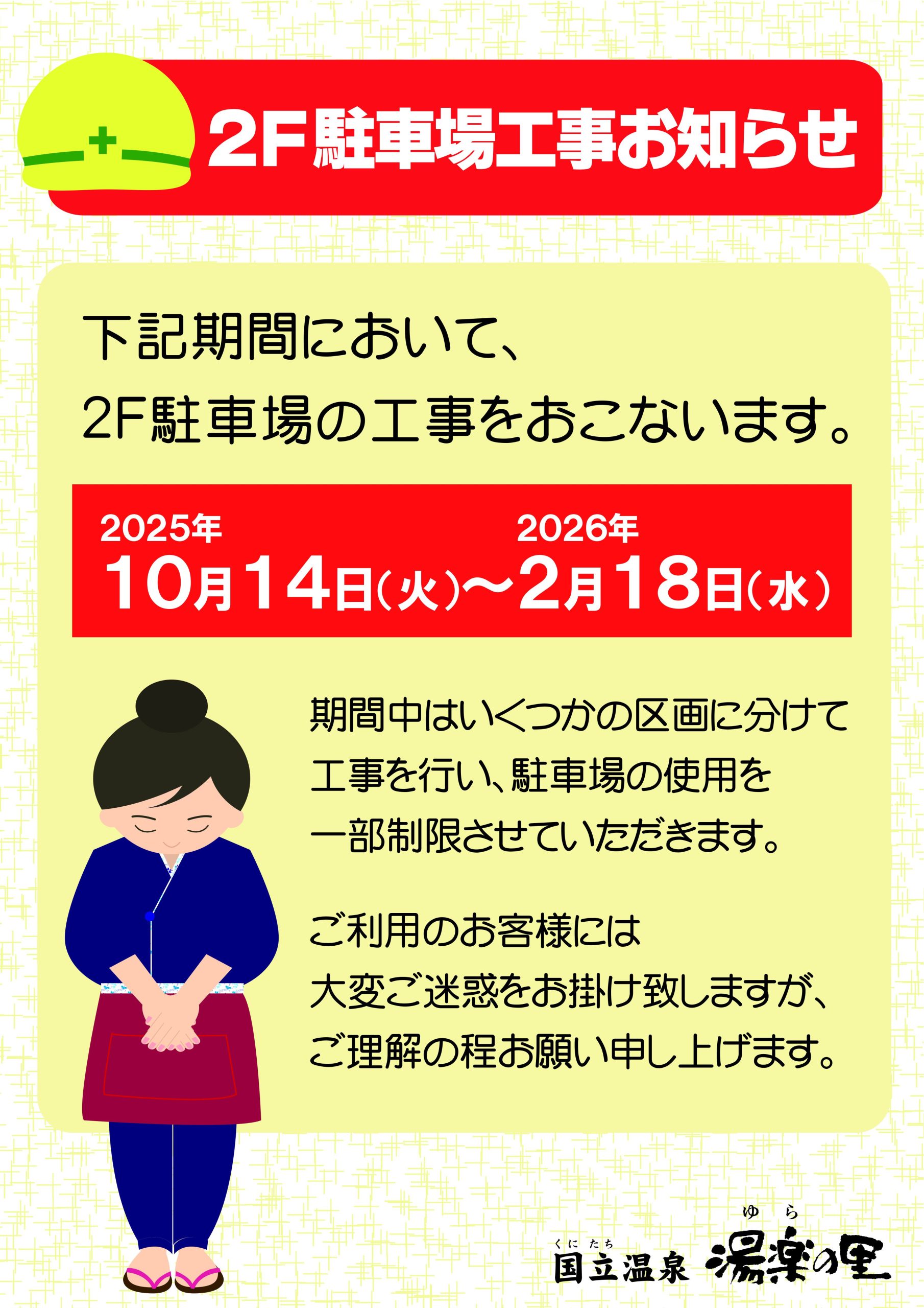 2階駐車場工事のお知らせ 令和7年10月14日(火)~令和8年2月18日(水)