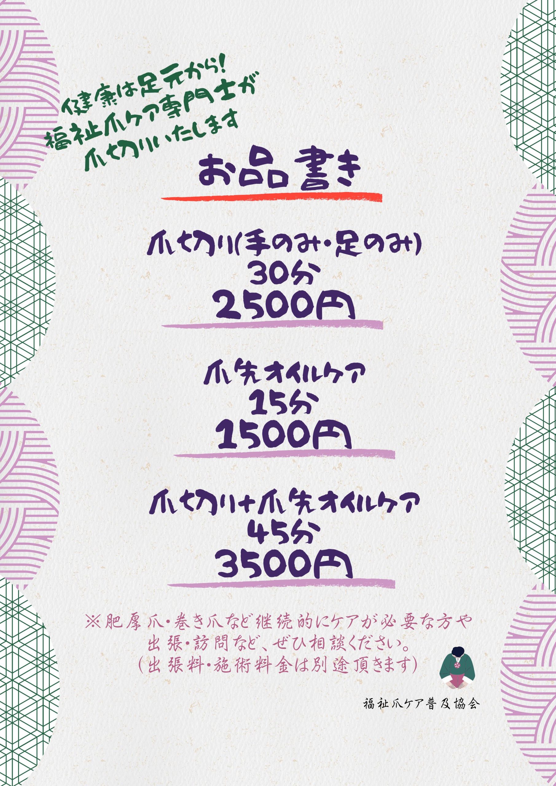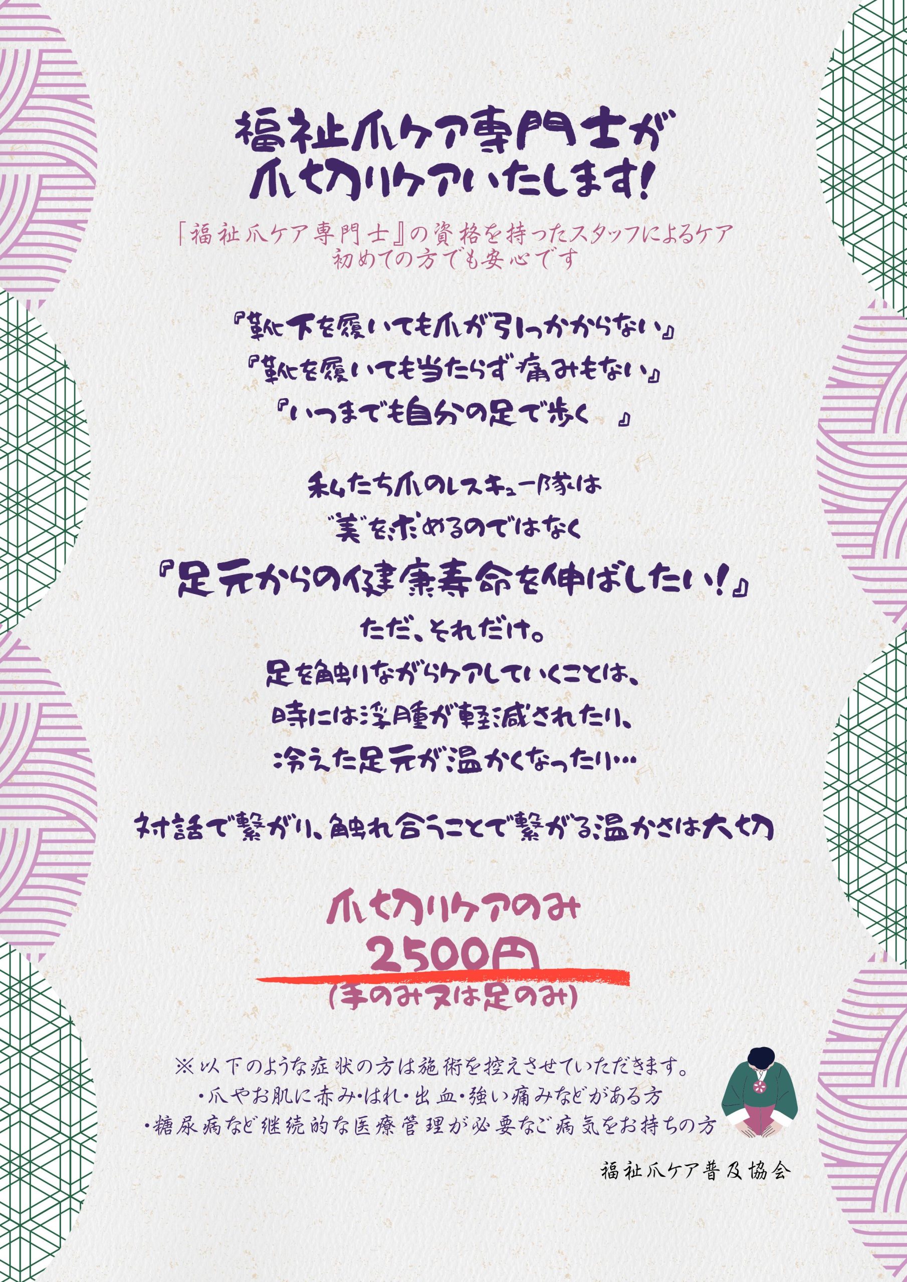 2025年11月02日 お知らせ 福祉爪ケア専門士による 「爪ケア」実施のお知らせ 福祉爪ケア専門士による爪ケアを実施いたします。 11月実施日は 11/3(月)、11/4(月)、11/11(火)、11/18(火)、11/25(火) 10時~17時頃までを予定しております。 福祉爪ケア専門士の資格を持ったスタッフによるケアを行います。 爪にお悩みがあるお客様、ご興味があるお客様 初めての方でも安心してご利用いただけます。是非この機会にご利用くださいませ。