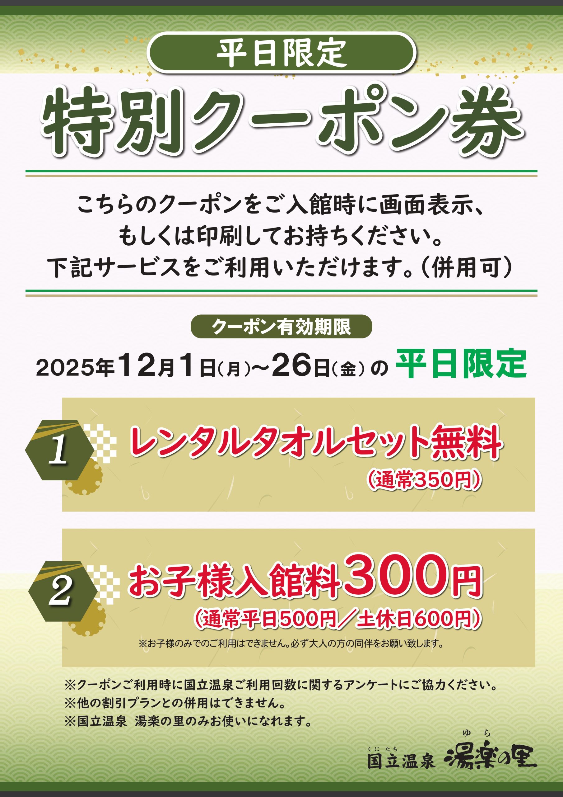 2025年12月01日 お得 ホームページ特別クーポン 12/1(月)~12/26(金) 12/1(月)~12/26(金)の平日限定で ご利用いただける特別クーポンです。 ご入館時にフロントにて画面表示、もしくは印刷をしてお持ちください。 ※1画面に付き1回の適用となります。(1画面で1名様のみ)