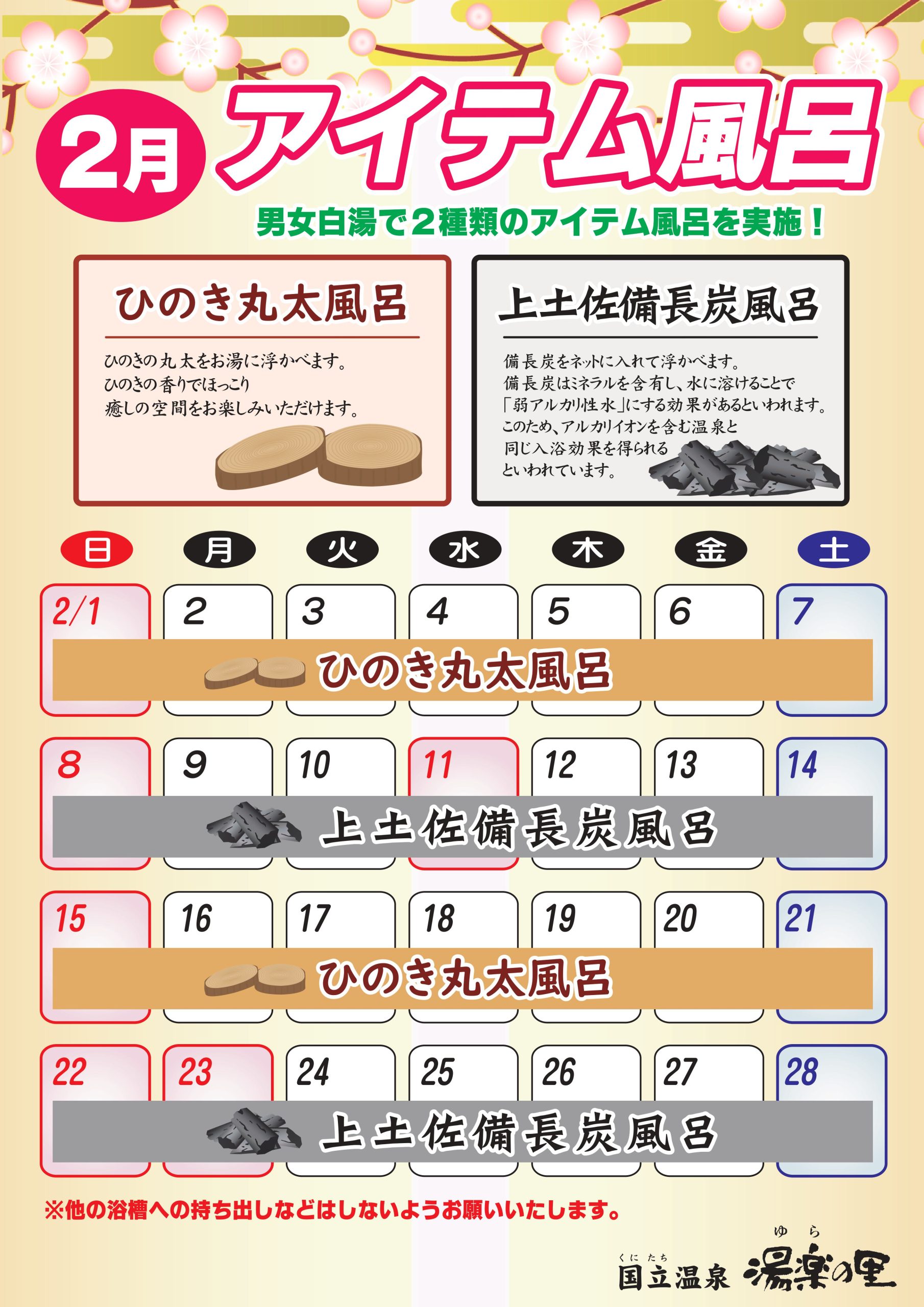 お知らせ 2026年02月01日 お知らせ 2月イベントのお知らせ 2/1(日)~2/28(土) 2月イベントのご案内です。 男女白湯にてアイテム風呂を実施いたします。 ご来店お待ちしております。 一覧に戻る