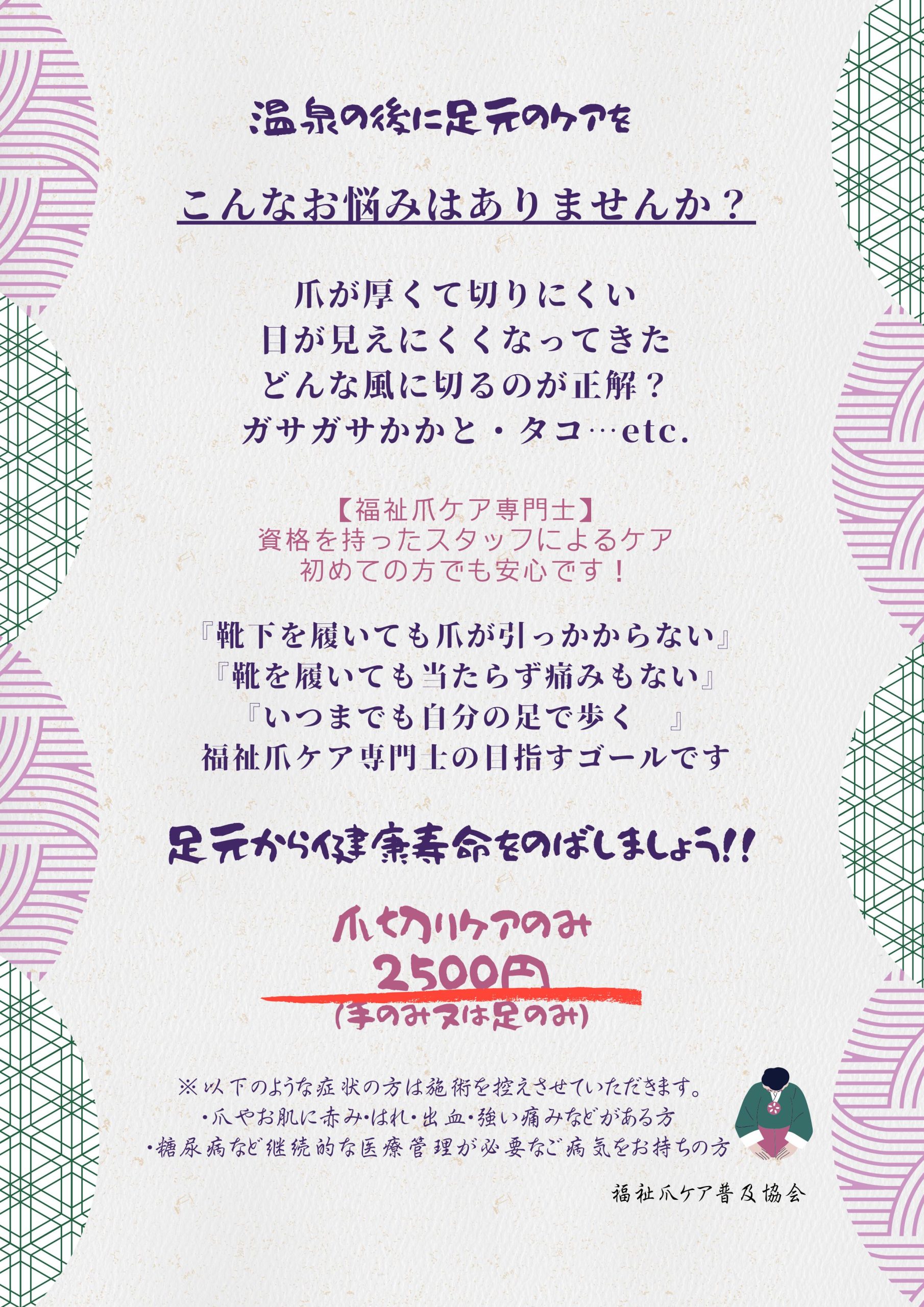 2026年03月02日 お知らせ 福祉爪ケア専門士による 「爪ケア」実施のお知らせ 福祉爪ケア専門士による爪ケアを実施いたします。 3月実施日は 3/3(火)、3/7(土)、3/10(火)、3/17(火)、3/24(火)、3/31(火) 10時~17時頃までを予定しております。 福祉爪ケア専門士の資格を持ったスタッフによるケアを行います。 爪にお悩みがあるお客様、ご興味があるお客様 初めての方でも安心してご利用いただけます。是非この機会にご利用くださいませ。 ※急遽休止となる場合もございます。ご了承ください。