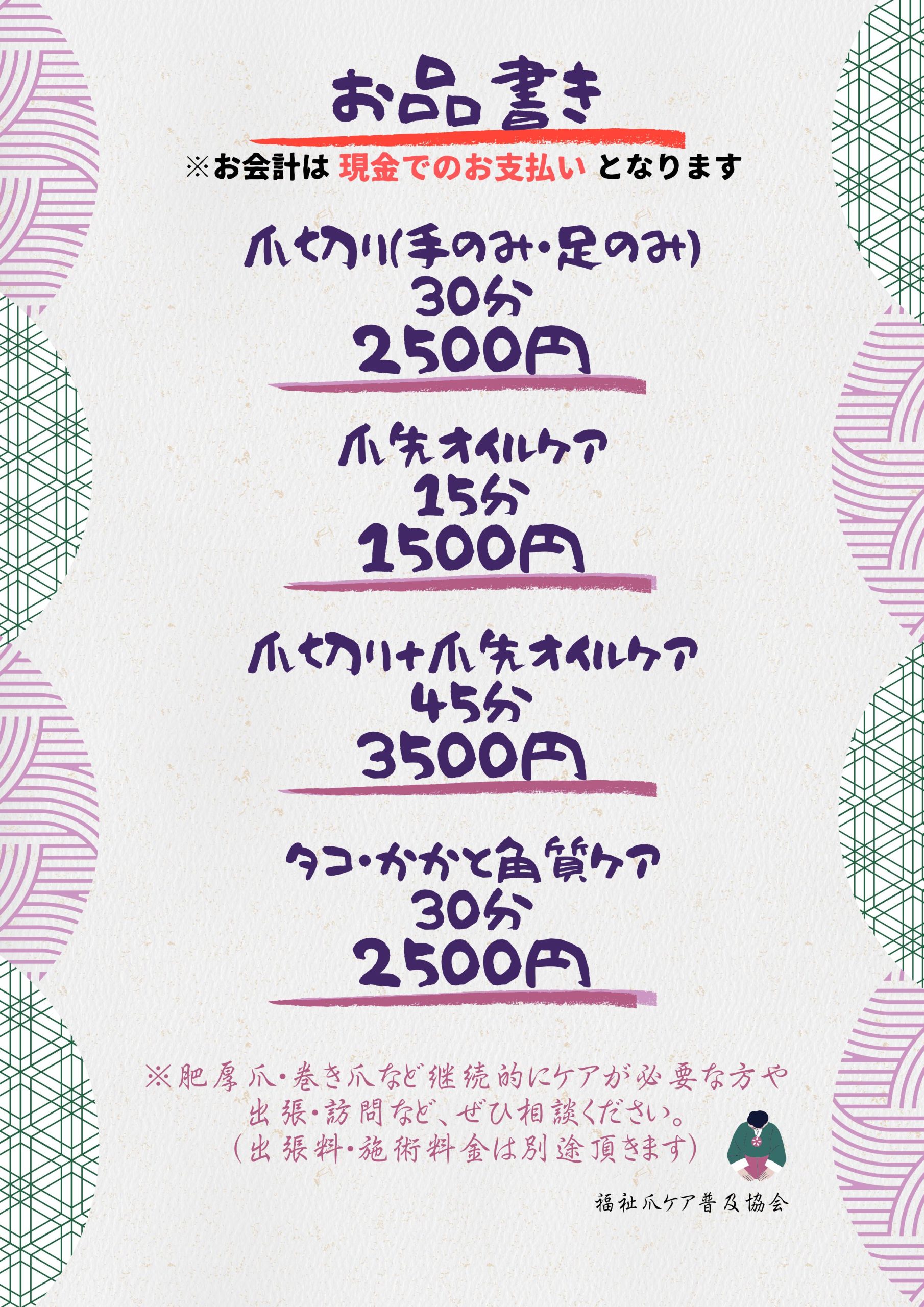 お知らせ 2026年03月02日 お知らせ 福祉爪ケア専門士による 「爪ケア」実施のお知らせ 福祉爪ケア専門士による爪ケアを実施いたします。 3月実施日は 3/3(火)、3/7(土)、3/10(火)、3/17(火)、3/24(火)、3/31(火) 10時~17時頃までを予定しております。 福祉爪ケア専門士の資格を持ったスタッフによるケアを行います。 爪にお悩みがあるお客様、ご興味があるお客様 初めての方でも安心してご利用いただけます。是非この機会にご利用くださいませ。 ※急遽休止となる場合もございます。ご了承ください。 一覧に戻る