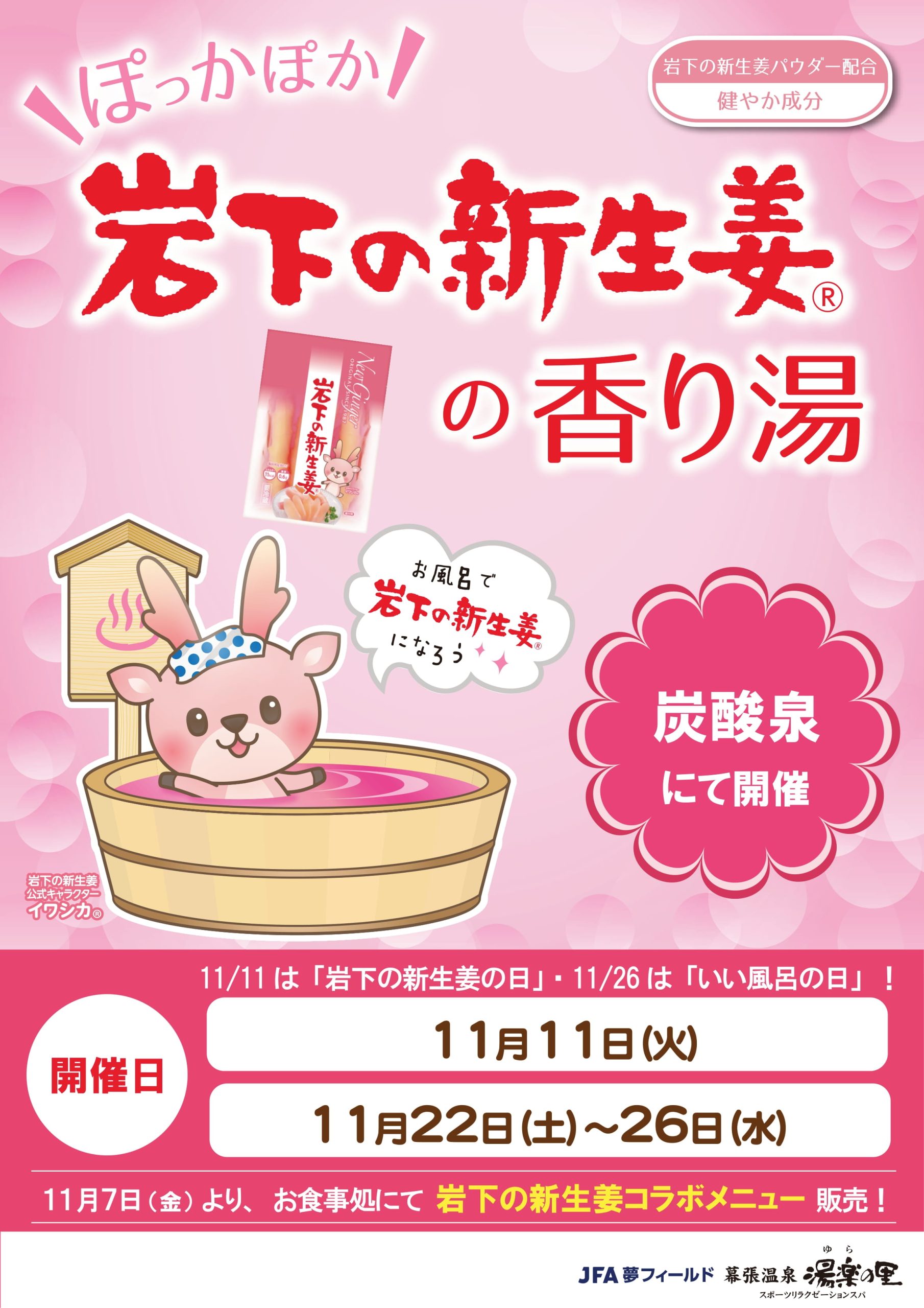 2025年11月5日キャンペーン・イベント 岩下の新生姜コラボイベント開催!(11/7~11/30) 今年もお風呂でぽかぽか、食事でぽかぽか「岩下の新生姜」コラボイベントを開催します! ・替わり湯「岩下の新生姜の香り湯」 岩下の新生姜の漬け液のような鮮やかなピンク色のお風呂をお楽しみ下さい! ・お食事処「岩下の新生姜コラボメニュー」 11/7(金)~11/30(日) 岩下の新生姜を使ったメニューを期間限定販売! お酒のつまみにはもちろん、お食事メニューでも毎年人気のコラボメニューです。