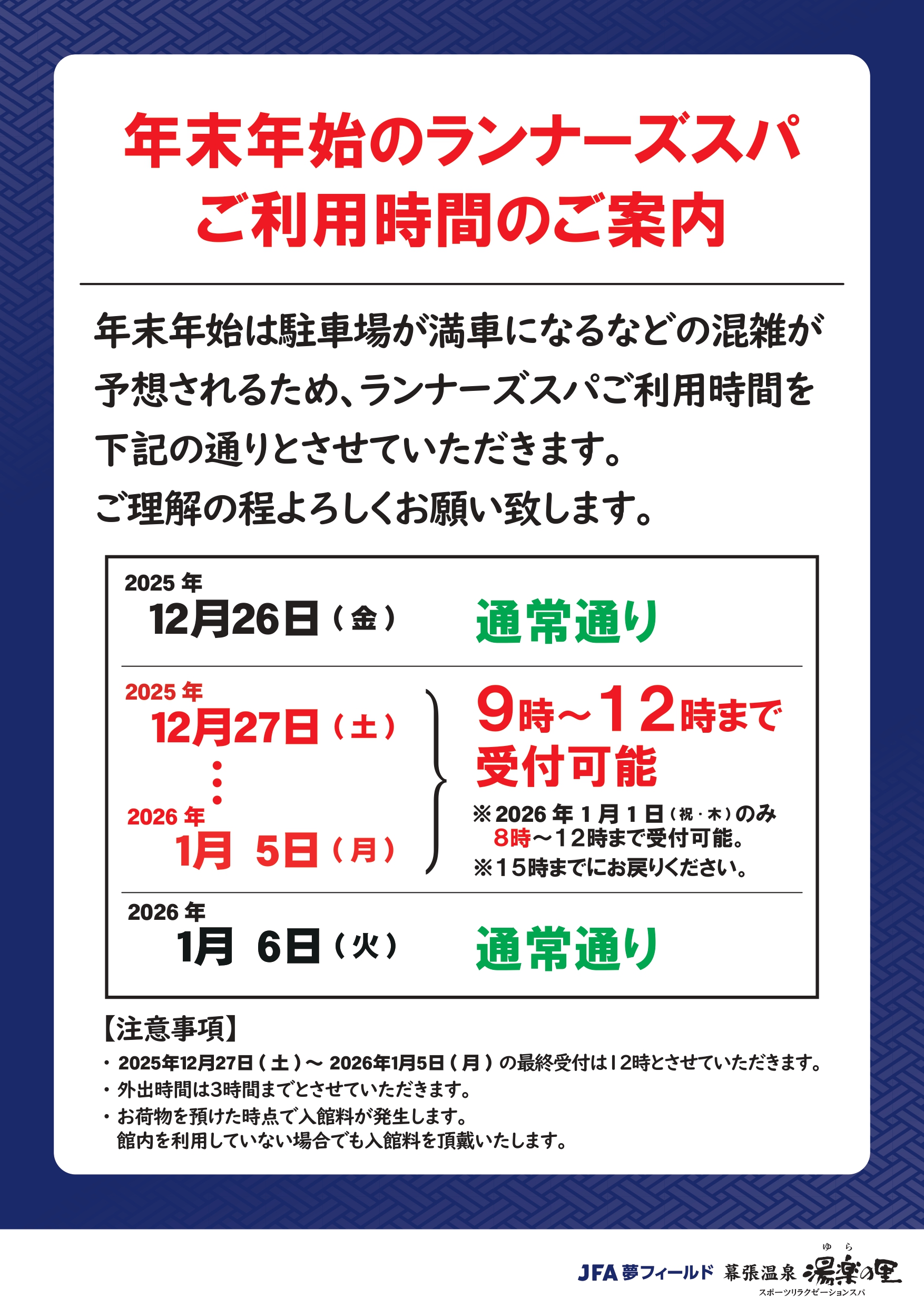 HOME 新着情報 年末年始のランナーズスパのご利用時間のご案内 12月27日(土)~2026年1月5日(月) 新着情報 2025年11月23日お知らせ 年末年始のランナーズスパのご利用時間のご案内 12月27日(土)~2026年1月5日(月) 一覧に戻る