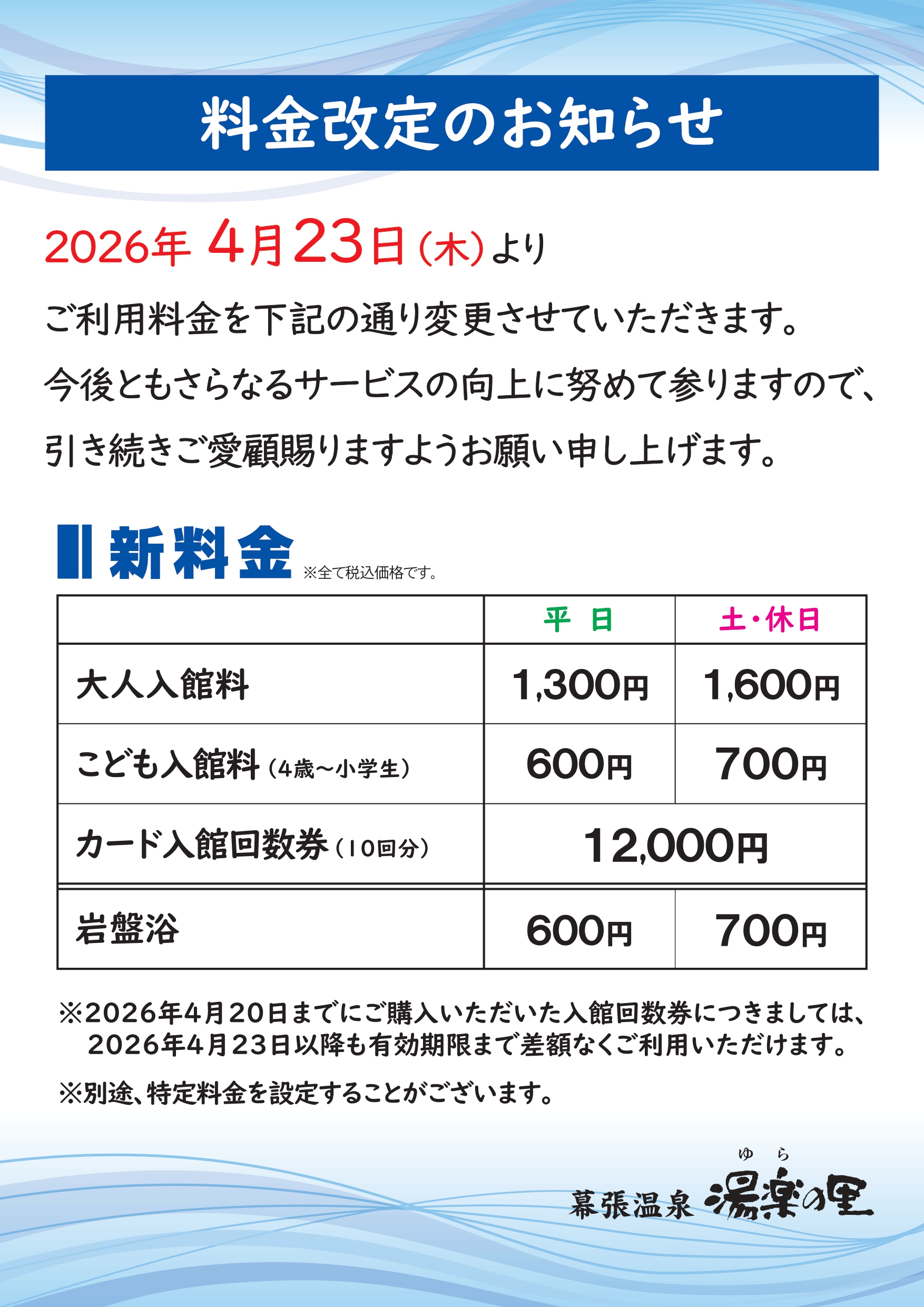 料金改定のお知らせ 2026年4月23日(木)~