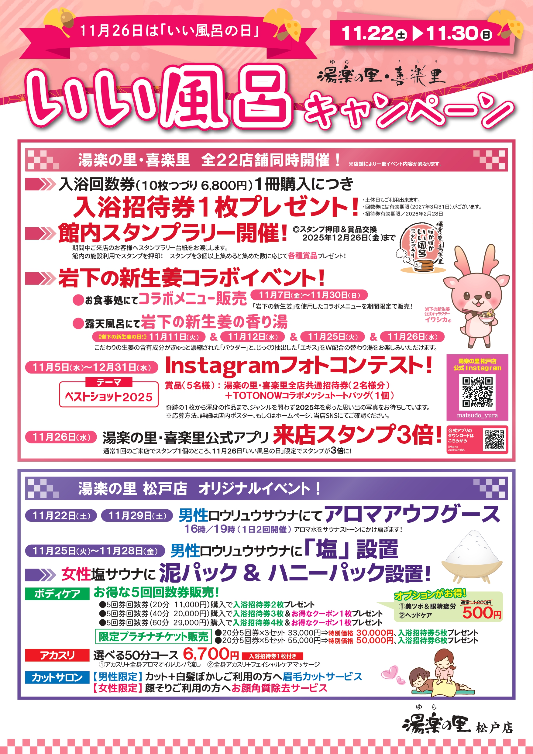 いい風呂キャンペーン開催!(11/22~11/30) 2025年11月05日キャンペーン・イベント 湯楽の里・喜楽里 いい風呂キャンペーン特設サイト 期間中、お得な特典付き回数券販売の他、沢山のイベントを開催します! 湯に浸かり、身体も心も温めてぽかぽかな冬をお過ごしください。