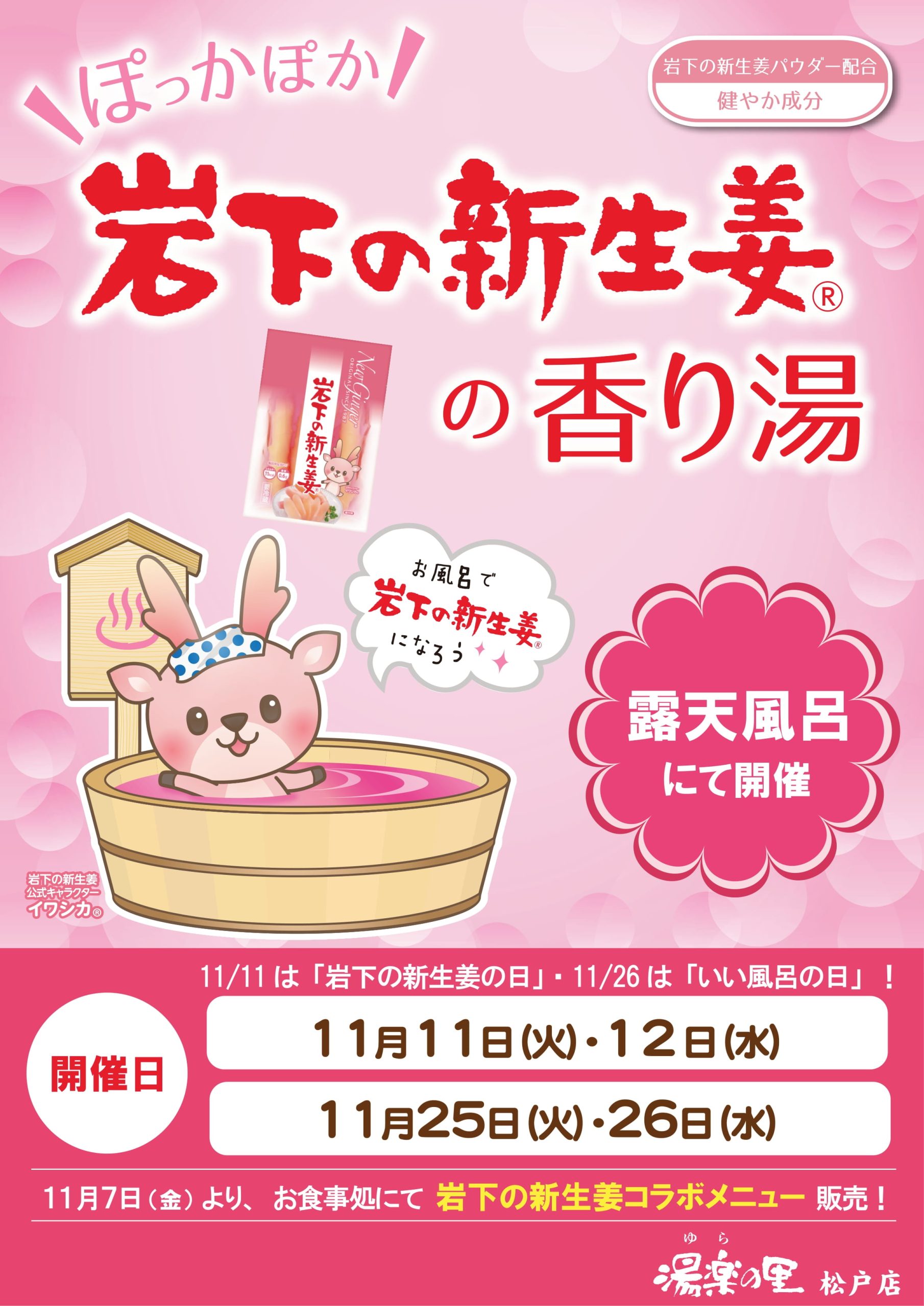 岩下の新生姜コラボイベント開催!(11/7~11/30) 2025年11月05日キャンペーン・イベント 今年もお風呂でぽかぽか、食事でぽかぽか「岩下の新生姜」コラボイベントを開催します! ・替わり湯「岩下の新生姜の香り湯」 岩下の新生姜の漬け液のような鮮やかなピンク色のお風呂をお楽しみ下さい! ・お食事処「岩下の新生姜コラボメニュー」 11/7(金)~11/30(日) 岩下の新生姜を使ったメニューを期間限定販売! お酒のつまみにはもちろん、お食事メニューでも毎年人気のコラボメニューです。