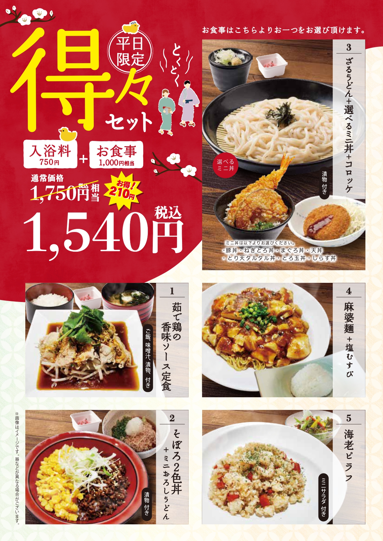 入浴料とお食事がセットになった【平日限定】得々セットのご案内♪