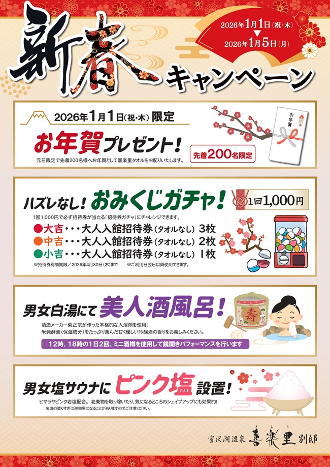 HOME 新着情報 新春キャンペーンのお知らせ 1月1日(木・祝)~1月5日(月) 2025/12/18キャンペーン・イベント 新春キャンペーンのお知らせ 1月1日(木・祝)~1月5日(月) 一覧に戻る