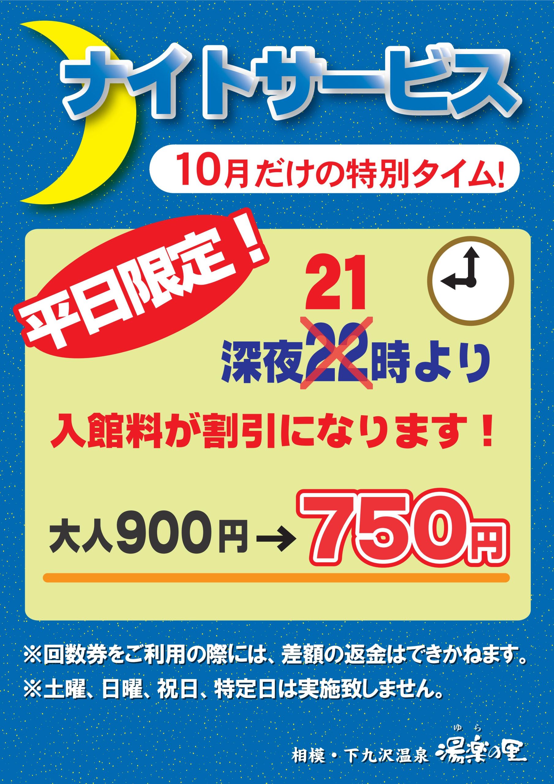 新着情報 2025/10/01お知らせ 10月限定!ナイトサービス21時より開催のお知らせ 通常22時からの平日限定ナイトサービスを【21時】より開始致します。 21時~23時30分に受付の方は、入館料が900円→750円に! 10月だけのお得なサービスです。 この機会に、是非ご利用くださいませ! 一覧に戻る