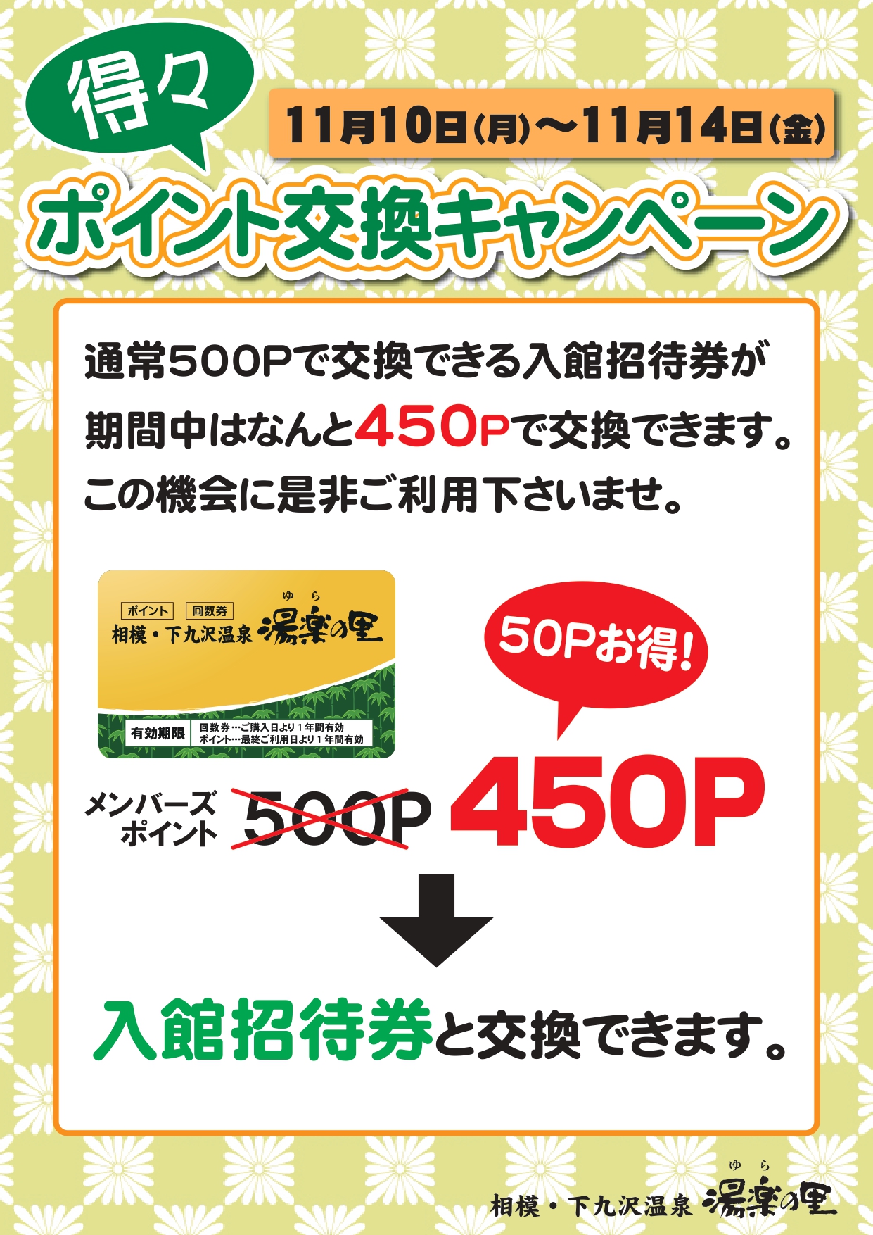 新着情報 2025/11/04お知らせ 得々ポイント交換キャンペーンのお知らせ【2025年11/10~11/14】 11月10日(月)~11月14日(金)の期間、得々ポイント交換キャンペーンを開催します。 通常500Pで交換できる入館招待券が450Pで交換できます。 この機会に是非、ご利用くださいませ。 一覧に戻る