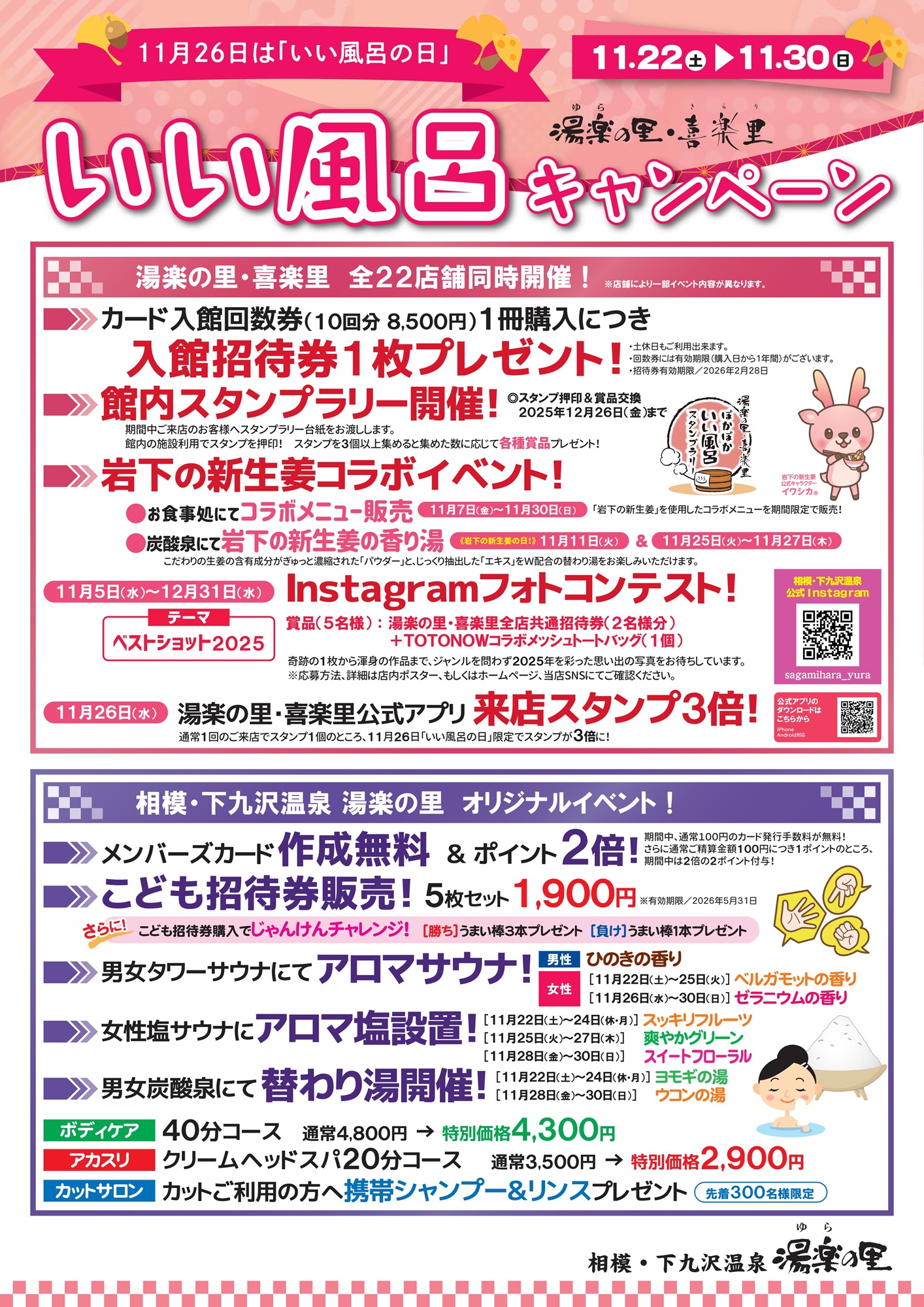 新着情報 2025/11/05キャンペーン・イベント いい風呂キャンペーン開催!(11/22~11/30) 湯楽の里・喜楽里 いい風呂キャンペーン特設サイト 期間中、お得な特典付き回数券販売の他、沢山のイベントを開催します! 湯に浸かり、身体も心も温めてぽかぽかな冬をお過ごしください。 一覧に戻る
