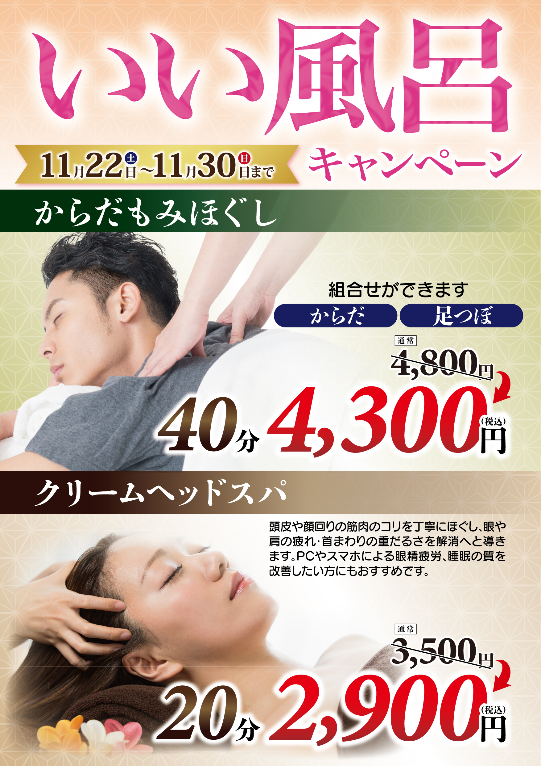 けんこう和心より、いい風呂キャンペーン期間限定コースのお知らせ【11/22~11/30】