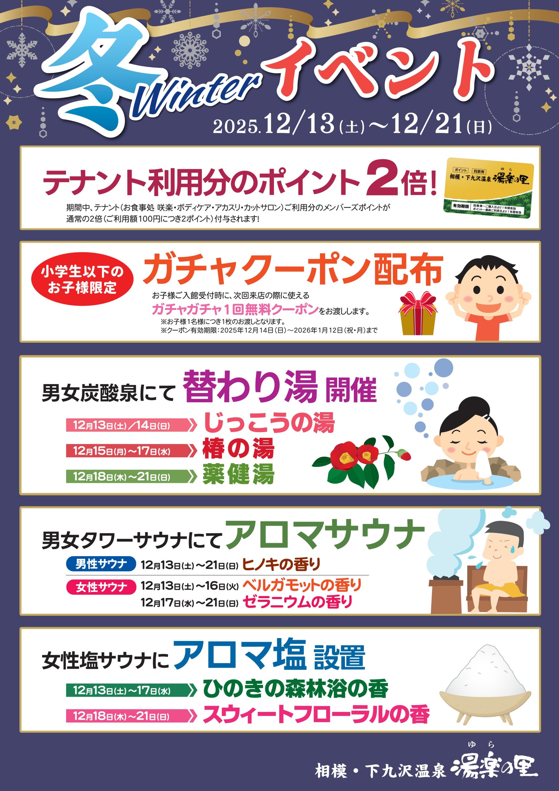 新着情報 2025/12/06お知らせ 冬イベントのお知らせ(12/13~12/21) 2025年12月13日(土)~12月21日(日)の期間中、冬イベントを開催します! 男女サウナにてアロマサウナや、炭酸泉浴槽にて替わり湯をお楽しみいただけます♪ 皆様のご来店、お待ちしております。 一覧に戻る