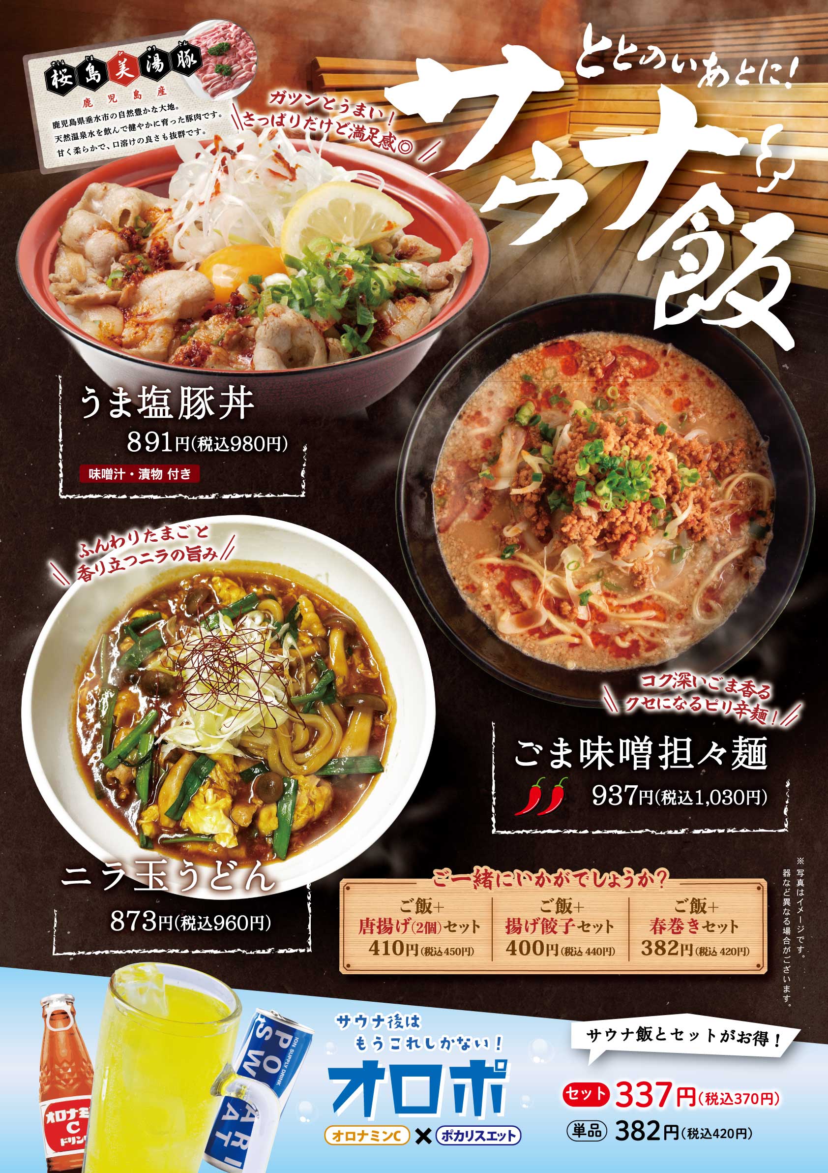 新着情報 2026/02/12お食事 お食事処 咲楽より、期間限定メニューのご案内 お食事処 咲楽では、サウナ後に食べたい栄養満点メニューをご用意しています。 サウナ飯と合わせて、オロポセットもおすすめです。 是非、ご賞味くださいませ! 一覧に戻る