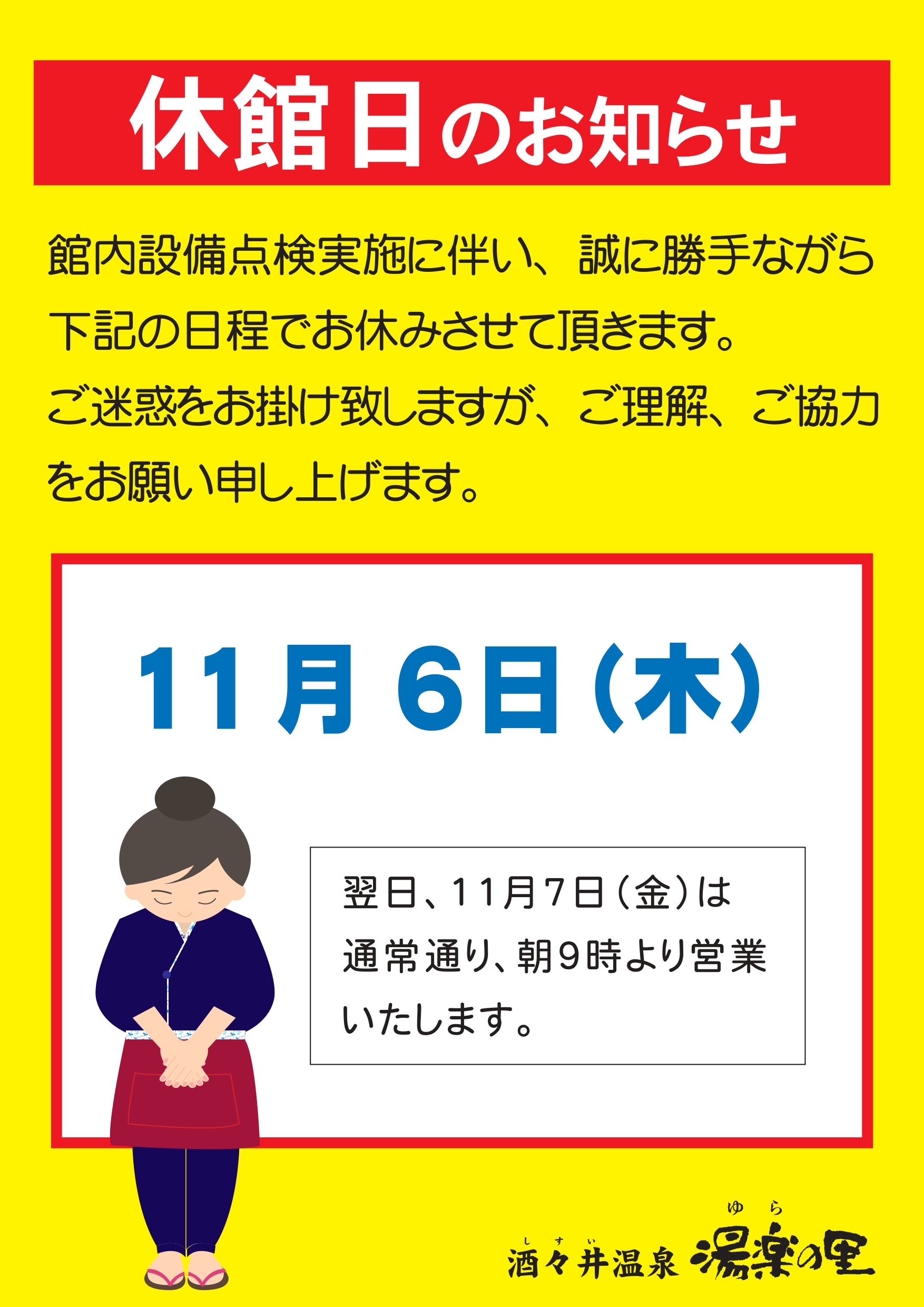 酒々井温泉からのお知らせ 2025年10月25日 湯楽の里だより【11月号】のご案内 2025年10月18日 【本家さぬきや】『秋の味覚』期間限定メニュー♪ 2025年10月13日 【本家さぬきや】期間限定!さんま塩焼きメニュー登場✨ 2025年10月10日 休館日のお知らせ【11月6日(木)】 2025年09月03日 第20回ニフティ温泉【年間ランキング2025】開催✨! 2025年04月01日 湯楽の里・喜楽里 公式アプリ会員募集中!