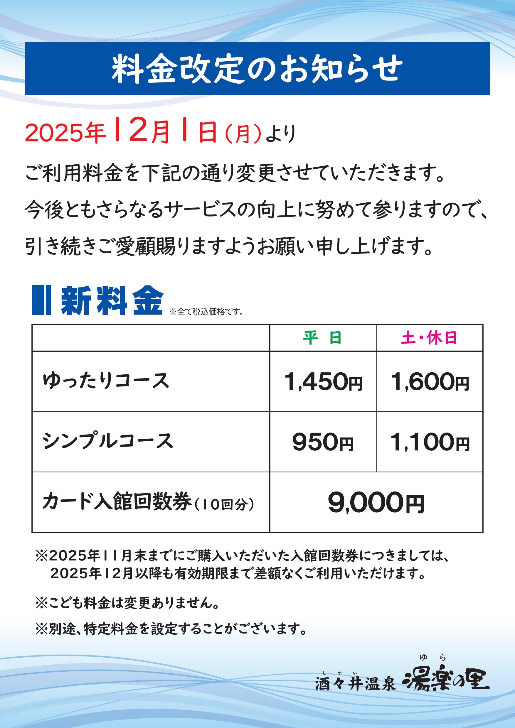 酒々井温泉からのお知らせ 2025年11月03日 料金改定のお知らせ(2025年12月1日~) 2025年10月25日 湯楽の里だより【11月号】のご案内 2025年10月18日 【本家さぬきや】『秋の味覚』期間限定メニュー♪ 2025年10月10日 休館日のお知らせ【11月6日(木)】 2025年09月03日 第20回ニフティ温泉【年間ランキング2025】開催✨! 2025年04月01日 湯楽の里・喜楽里 公式アプリ会員募集中!