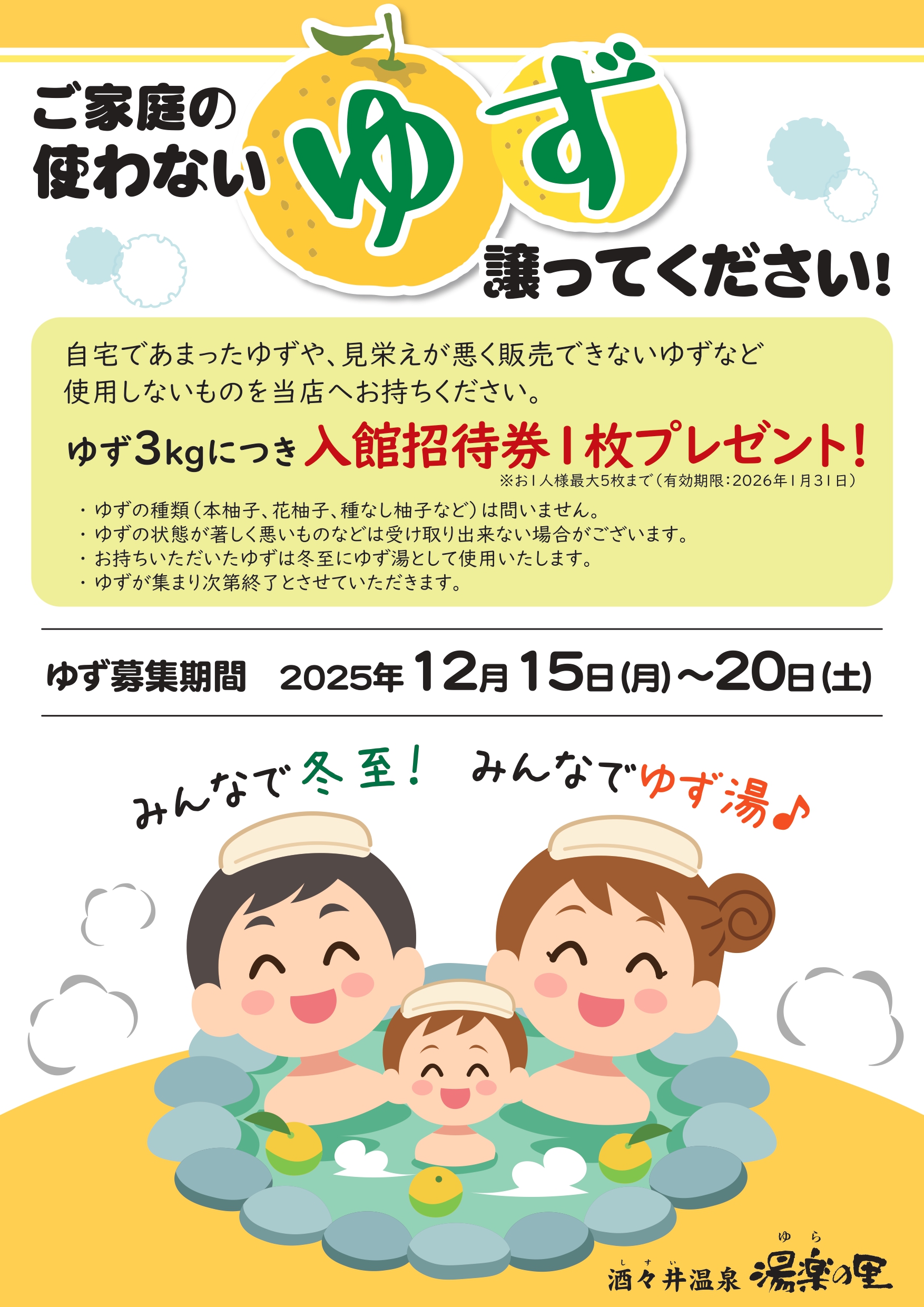 12月22日(月・冬至)に【ゆず湯】を開催します!
