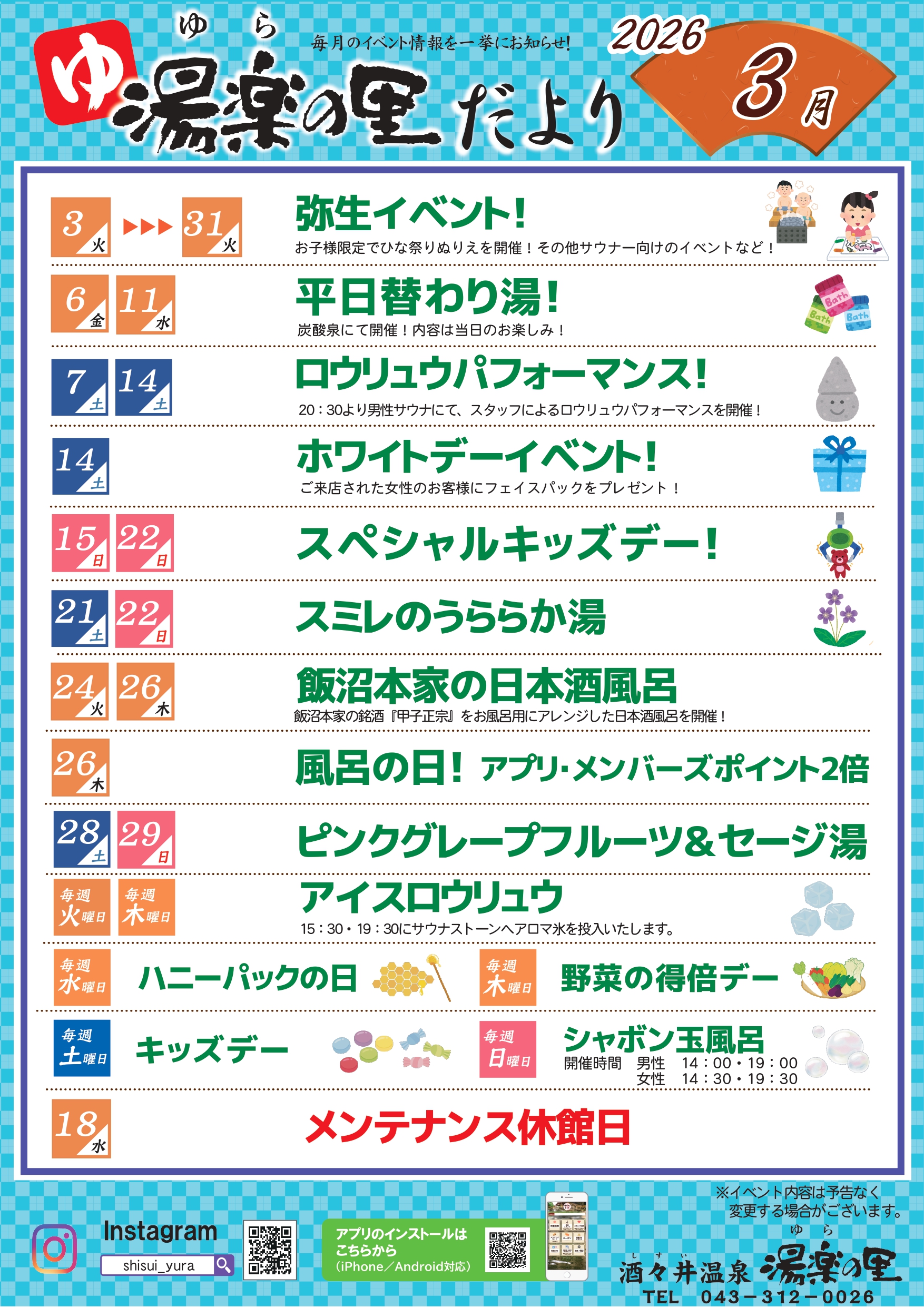 酒々井温泉からのお知らせ 2025年11月03日 料金改定のお知らせ(2025年12月1日~) 2026年03月06日 【MAXSLIM】期間限定!新生活応援キャンペーン✨ 2026年03月06日 【体癒し処】”春のととのえボディキャンペーン”開催中! 2026年03月06日 『弥生イベント』開催中! 2026年02月27日 湯楽の里だより【3月号】のご案内 2026年02月21日 【本家さぬきや】サウナ飯”第3弾”ラーメンフェス開催✨ 2026年02月20日 【本家さぬきや】梅祭りメニュー開催中! 2026年02月20日 休館日のお知らせ【3月18日(水)】 2026年02月05日 5/6(水・休)まで! 酒々井町ぐるっとスタンプラリー! 2025年04月01日 湯楽の里・喜楽里 公式アプリ会員募集中!