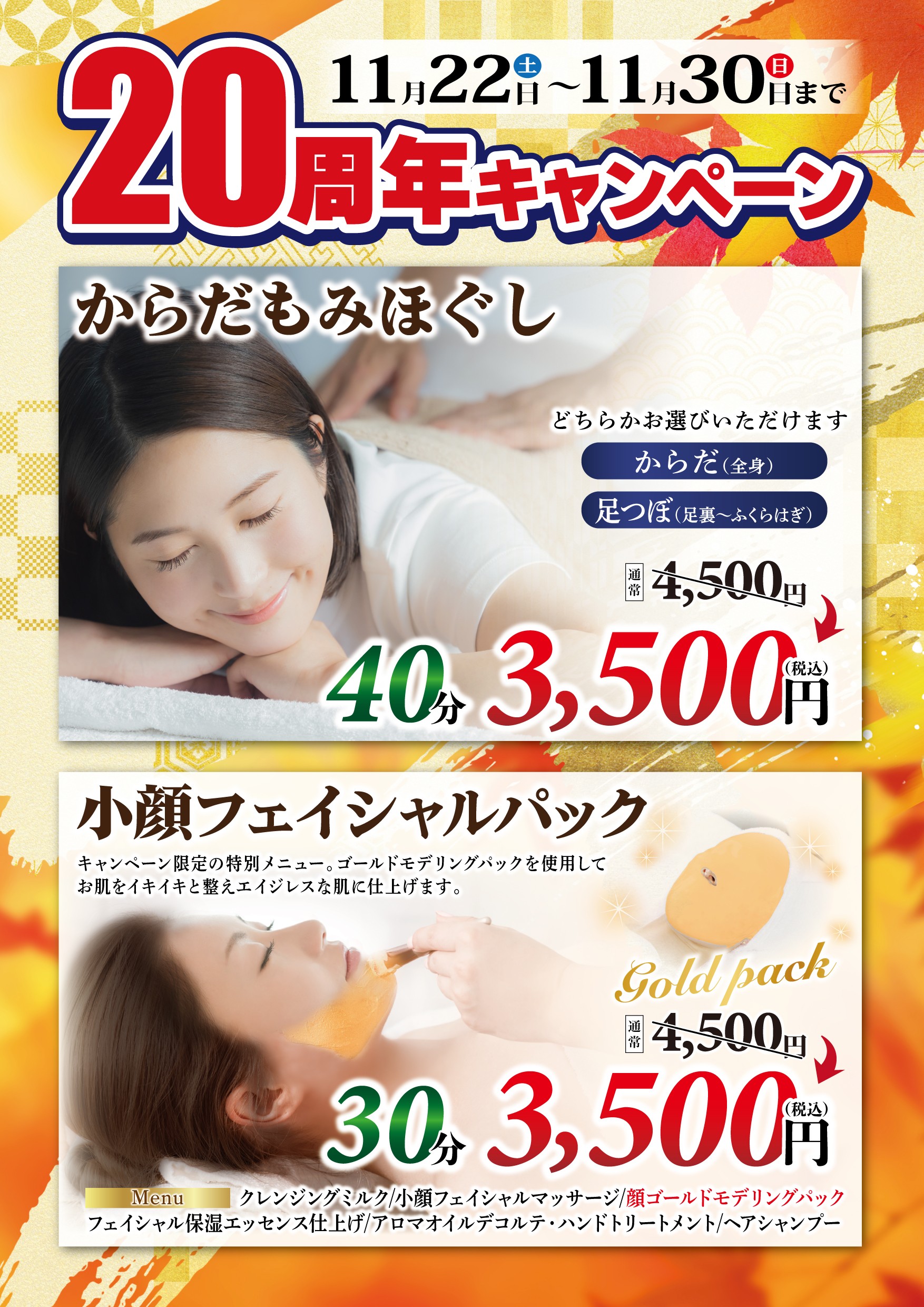 「癒し処・美肌処 和」より20周年キャンペーンのお知らせ!