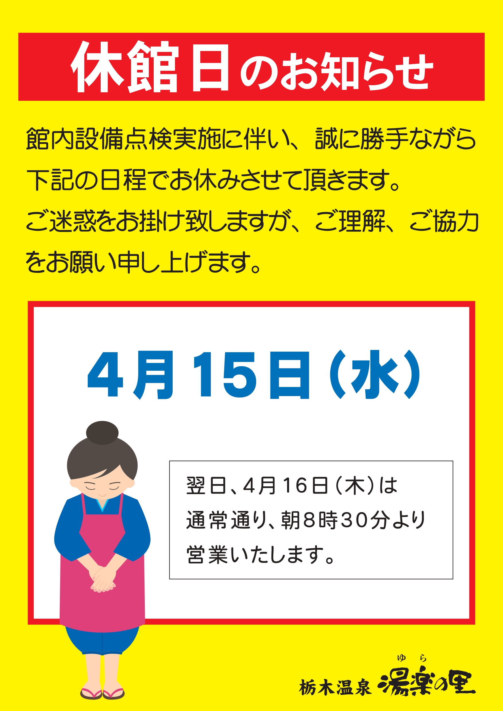 休館日のお知らせ 4月15日(水)
