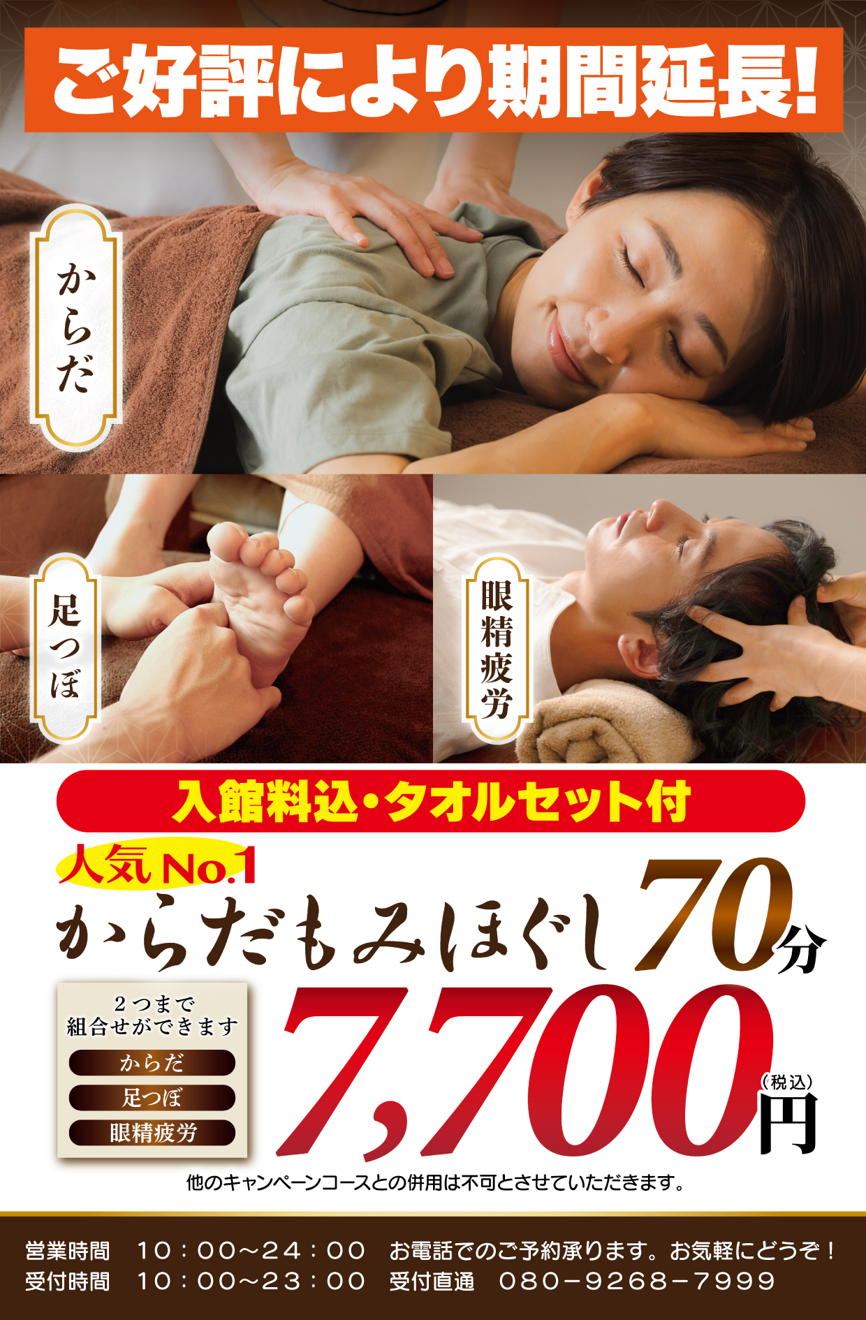 整体室~癒夢心~より【期間限定 からだもみほぐし70分】のお知らせ