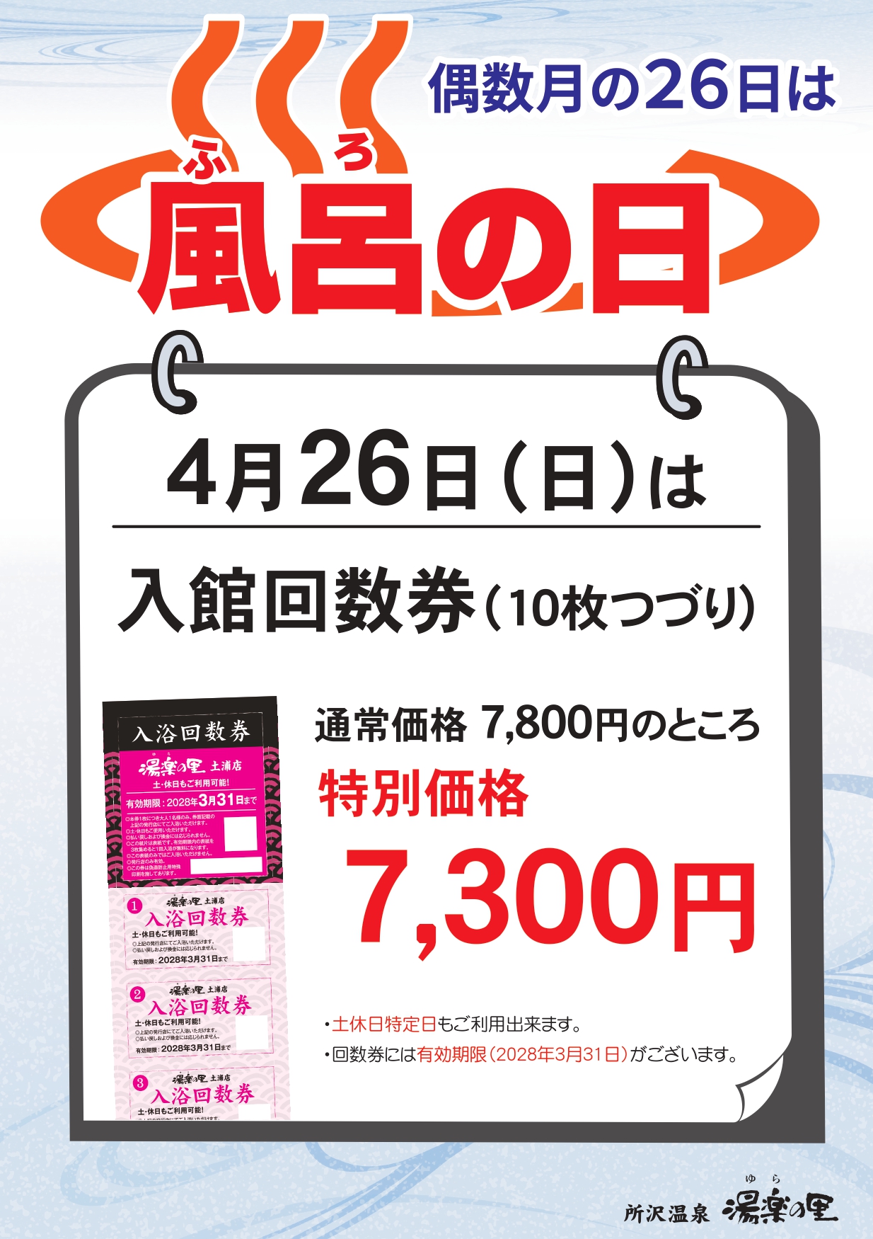 【風呂の日】入館回数券特別販売のお知らせ 4月26日(日)