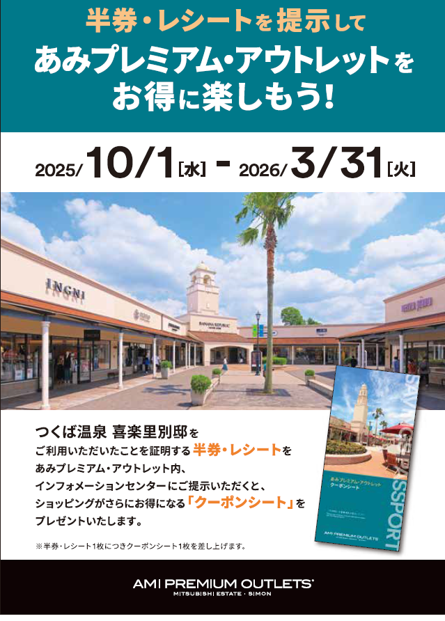 つくば温泉喜楽里別邸のレシートを掲示して「あみプレミアム・アウトレット」をお得に楽しもう!