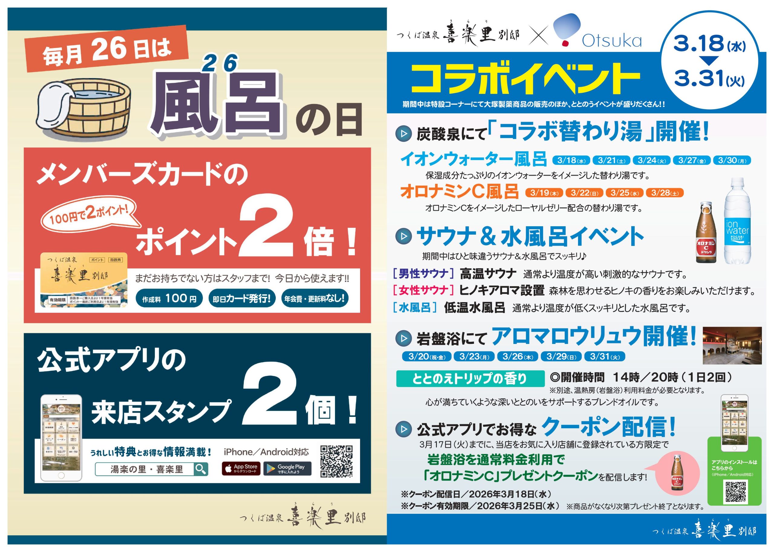 3/18(水)~3/31(火)【大塚製薬×つくば温泉 喜楽里別邸 コラボイベント】開催のお知らせ