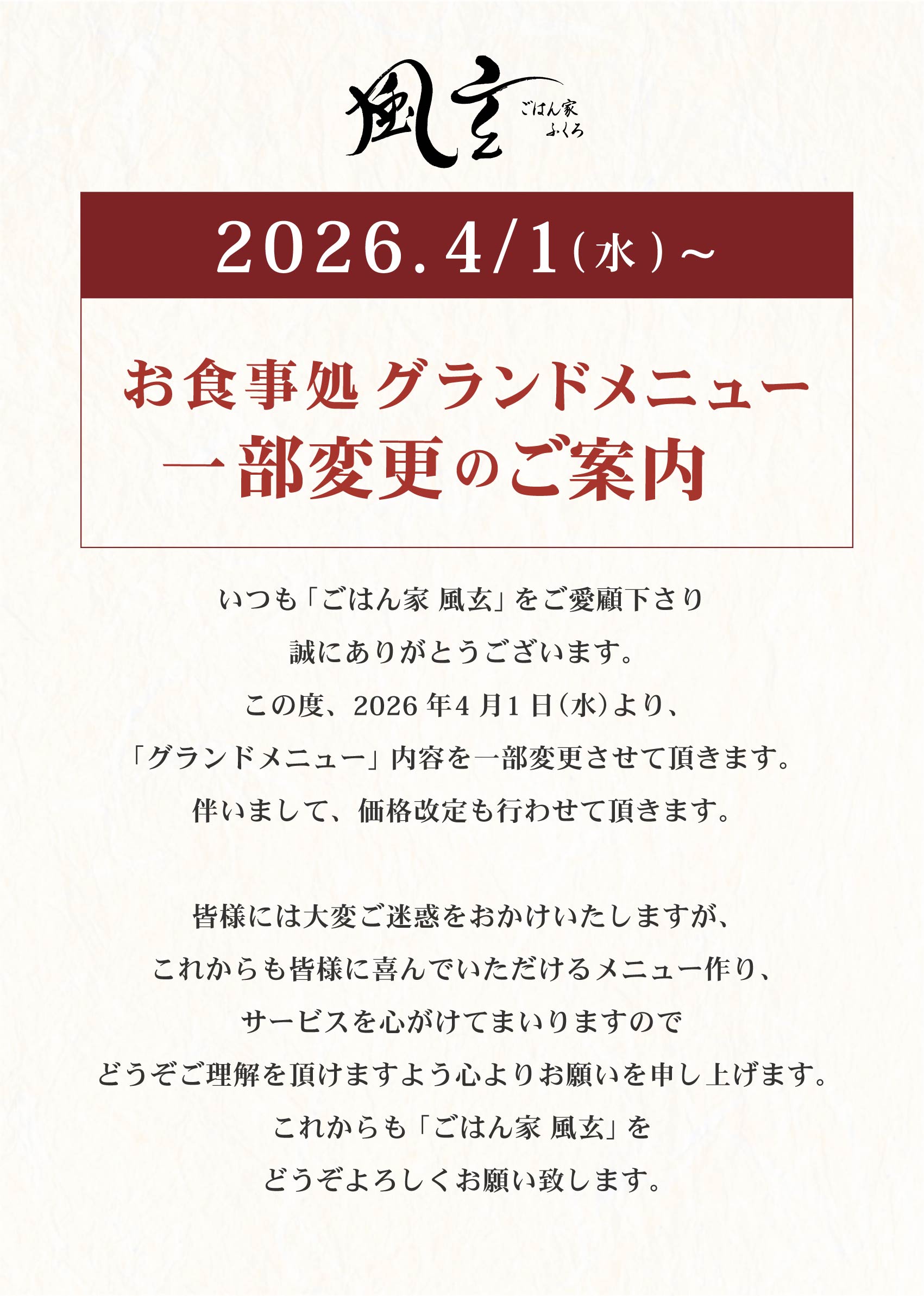 お食事処【ごはん家 風玄】より、「グランドメニューリニューアル」のお知らせ!